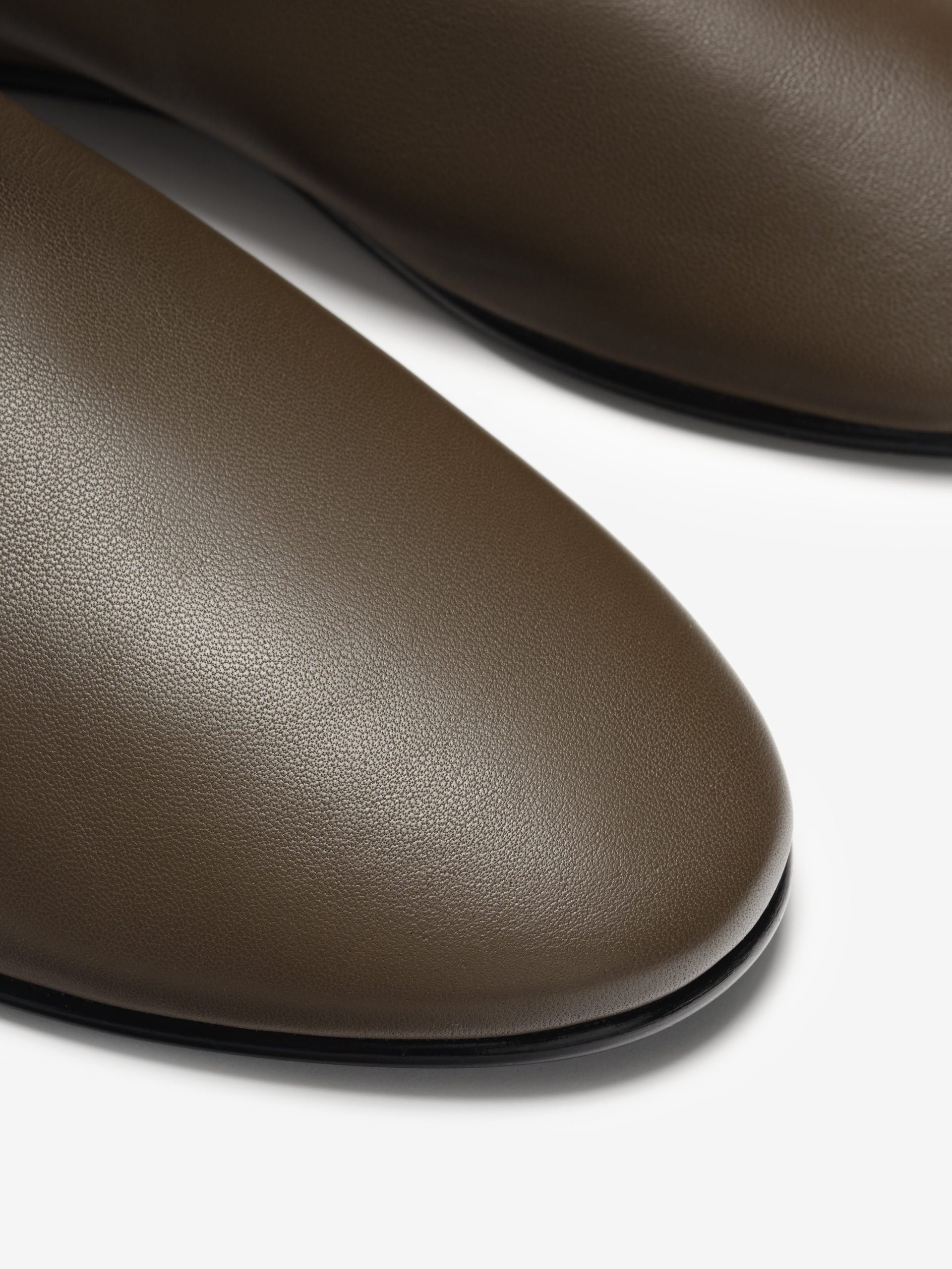 The Ballerino is a crafted in Italy from a Napa leather with a handmade wooden sole. The slip-on style is designed with a contemporary silhouette. and collapsible heel cup.