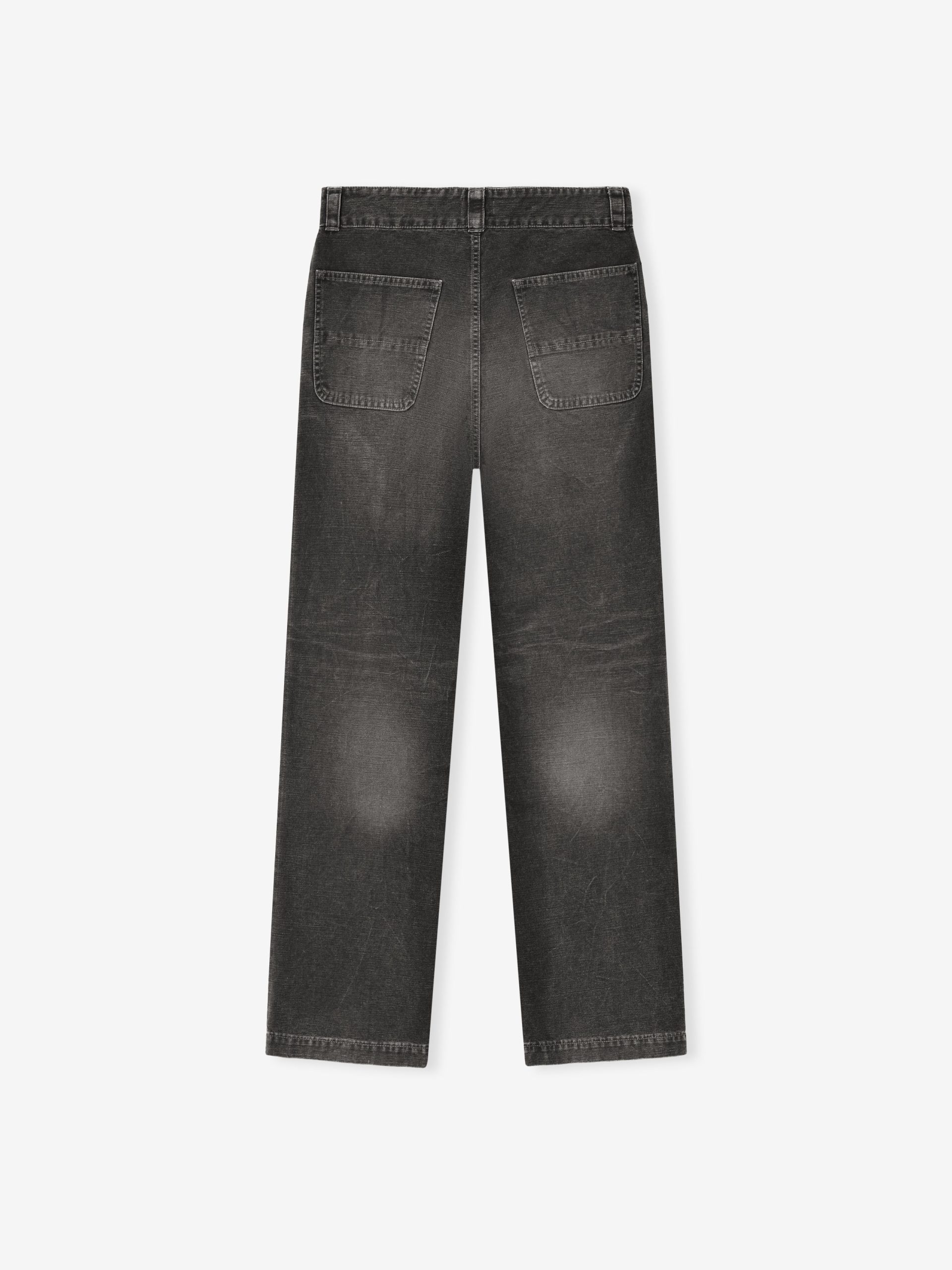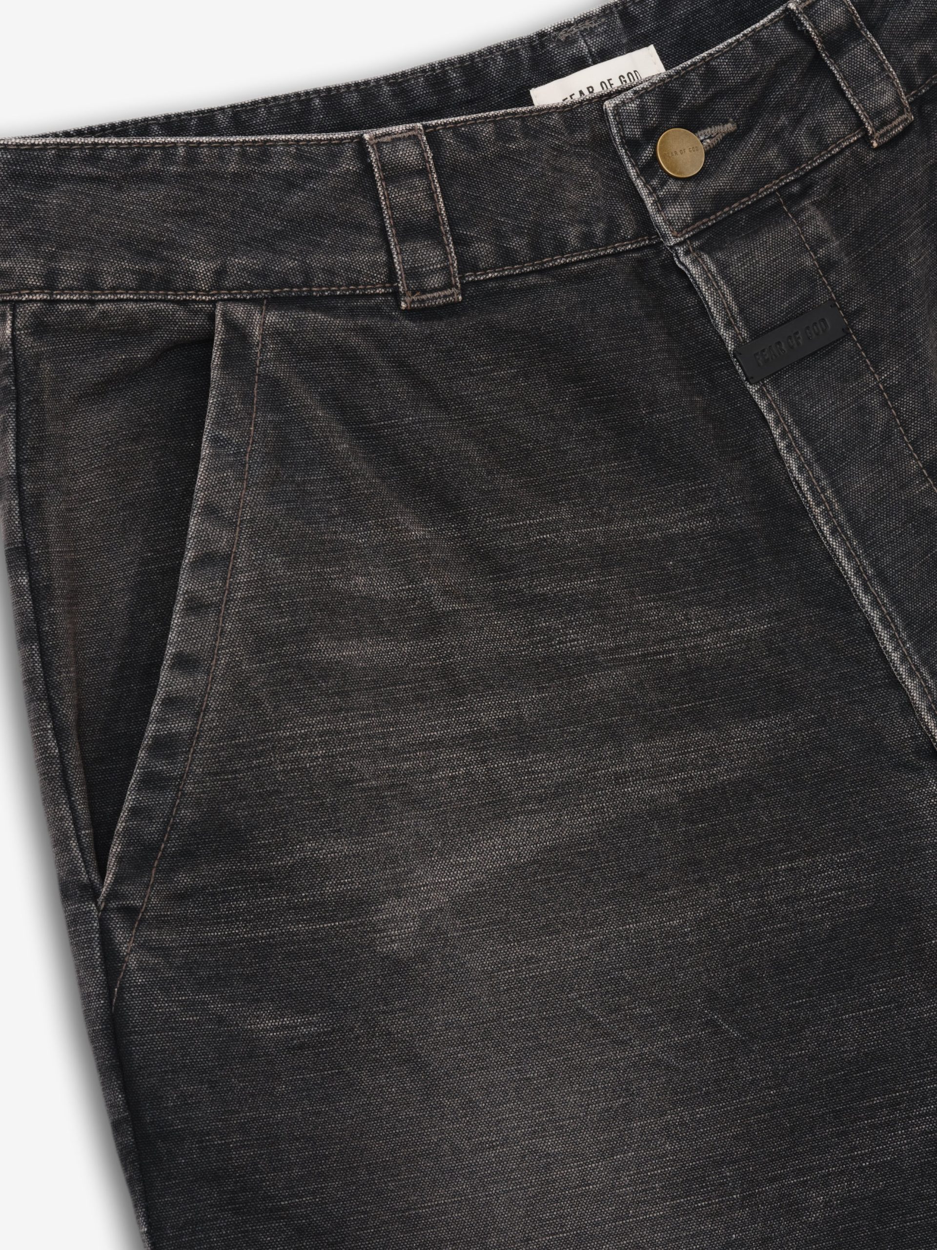 The Utility Trouser is made in Japan from 100% cotton canvas with a garment wash and hand distressing. The workwear style has a relaxed. straight leg for comfort. Features include antique metal hardware. slant pockets. large utility pockets on the back. and a Fear of God label on the center front.