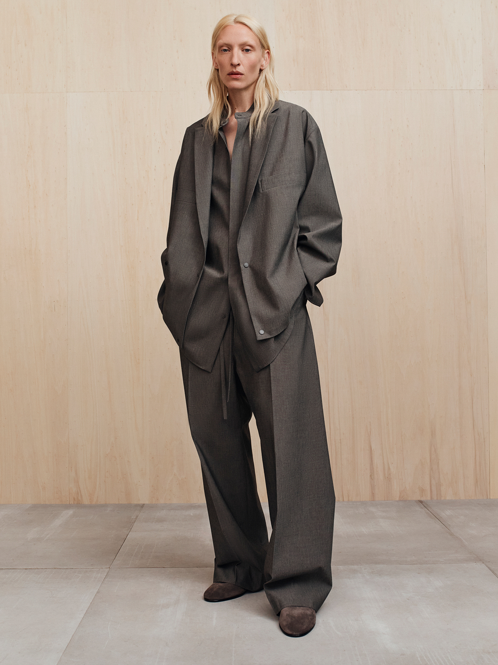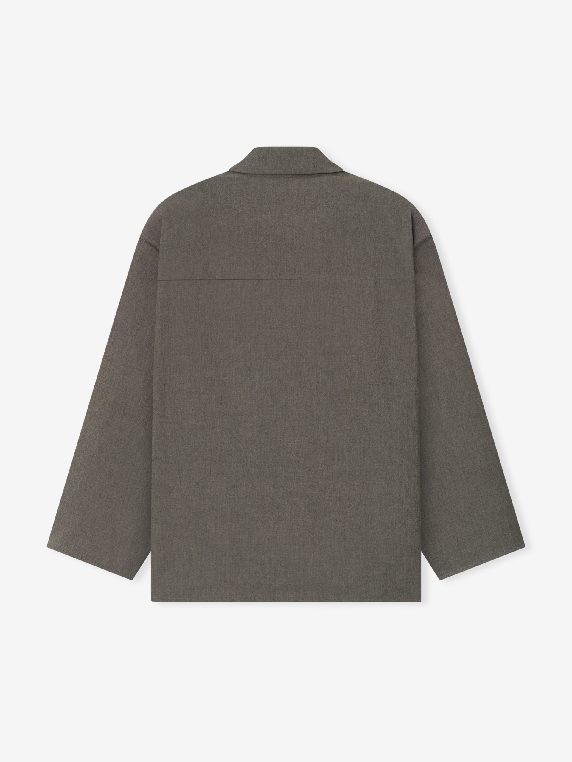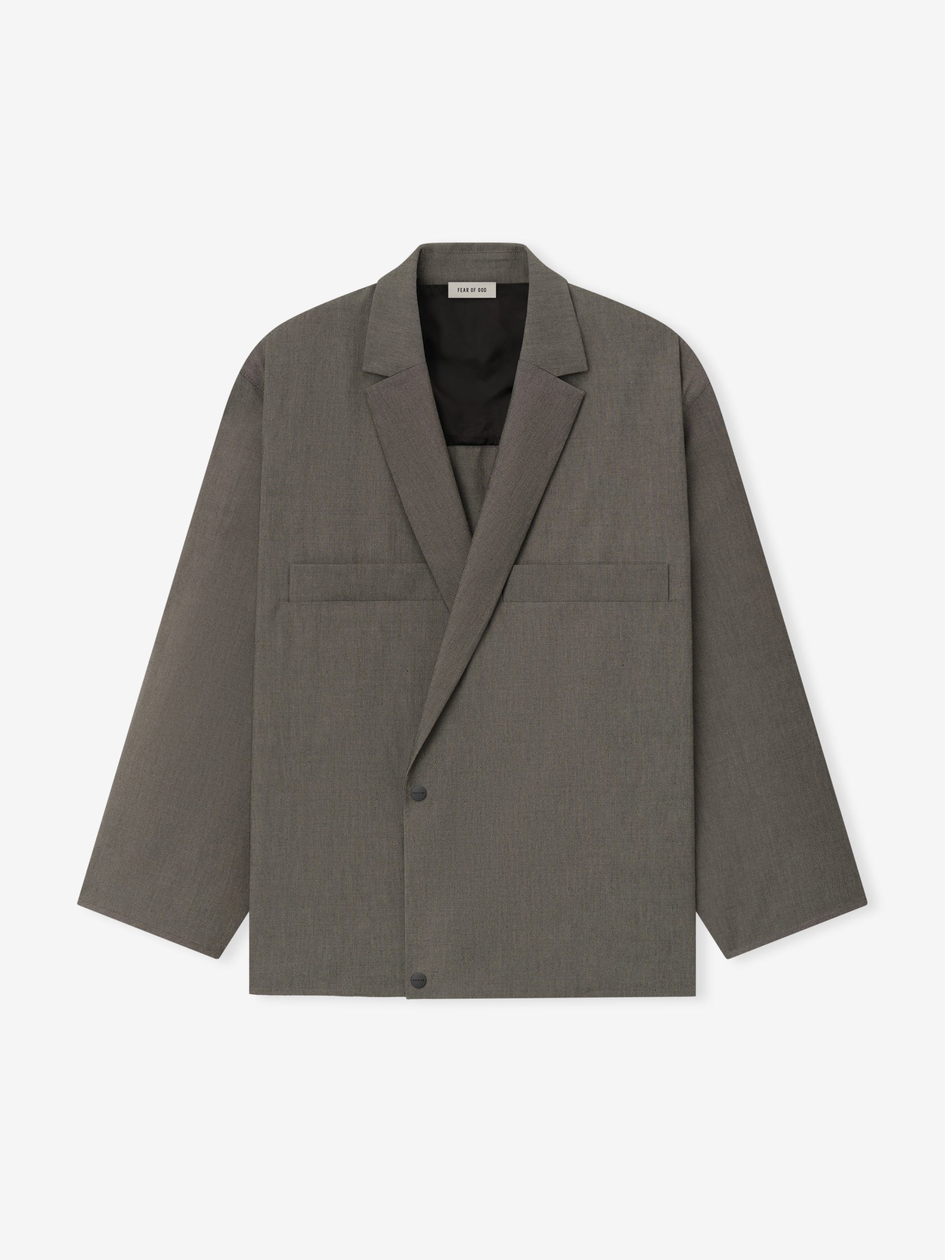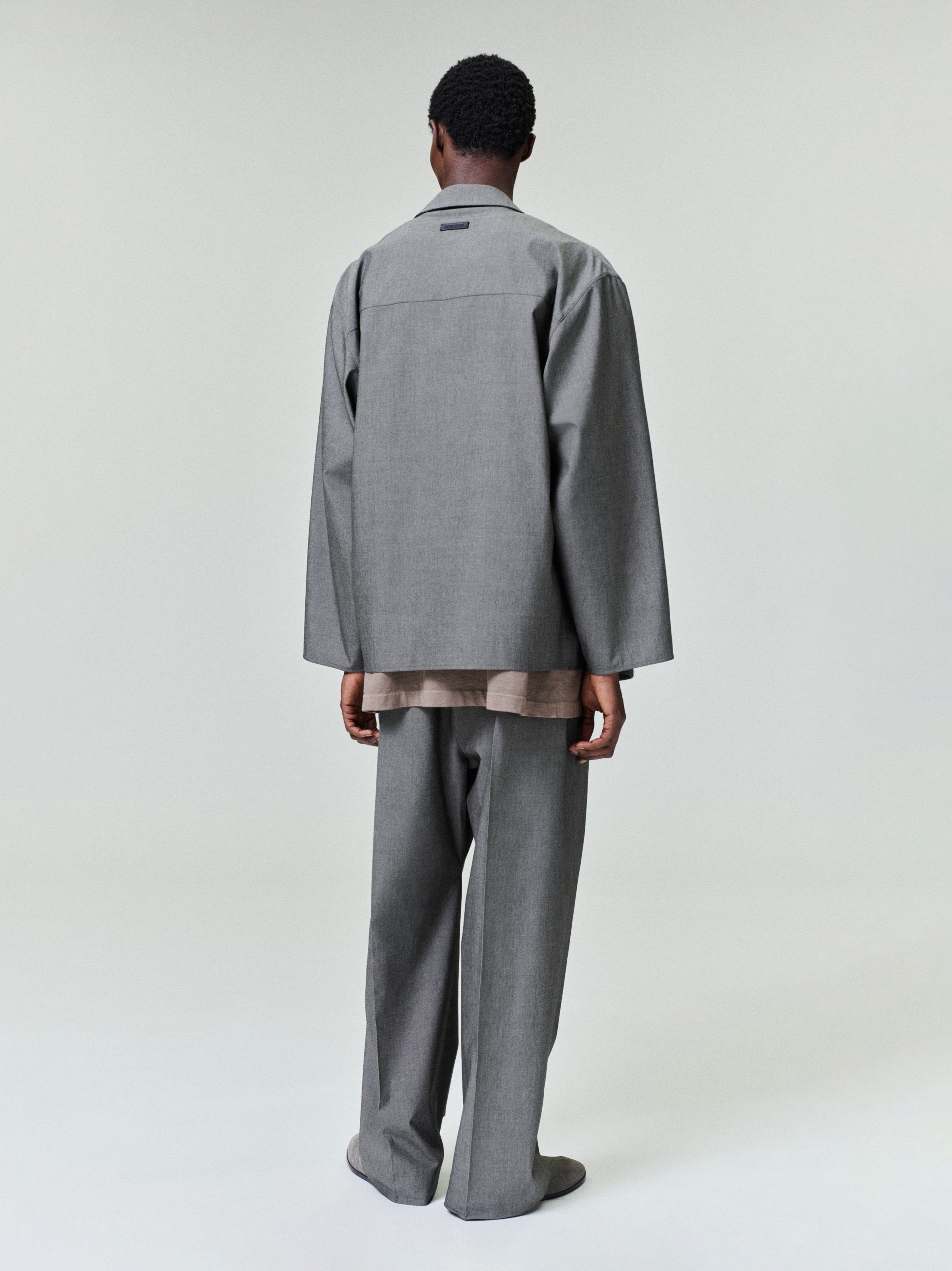 The Shirt Jacket is tailored in Italy from cotton–wool oxford with a clean. crisp hand. Unlined and casual in construction. the jacket is designed with a relaxed fit and features a two-snap button front closure and welted pockets. The piece is finished with the iconic Fear of God four-stitch label at the center back.