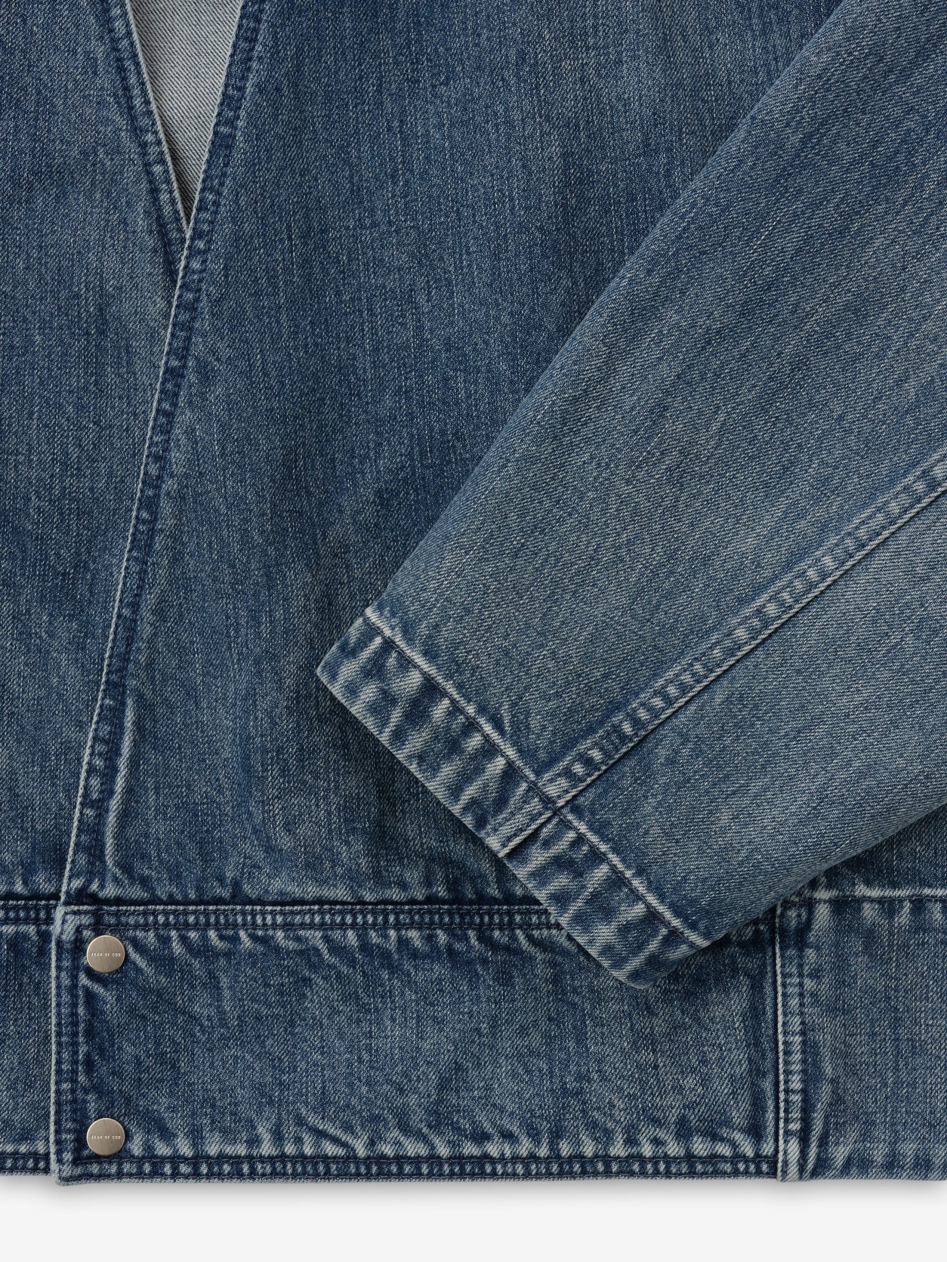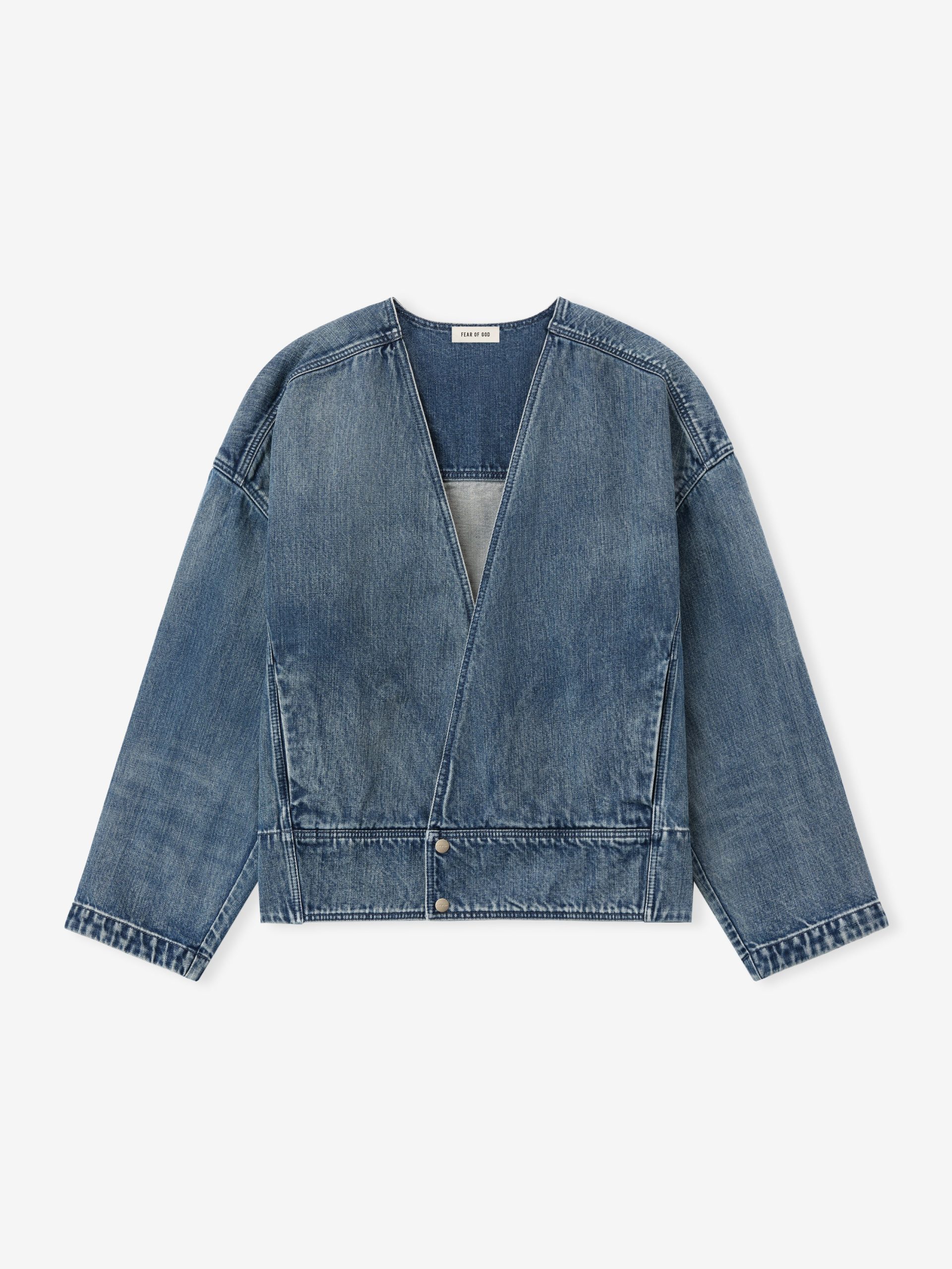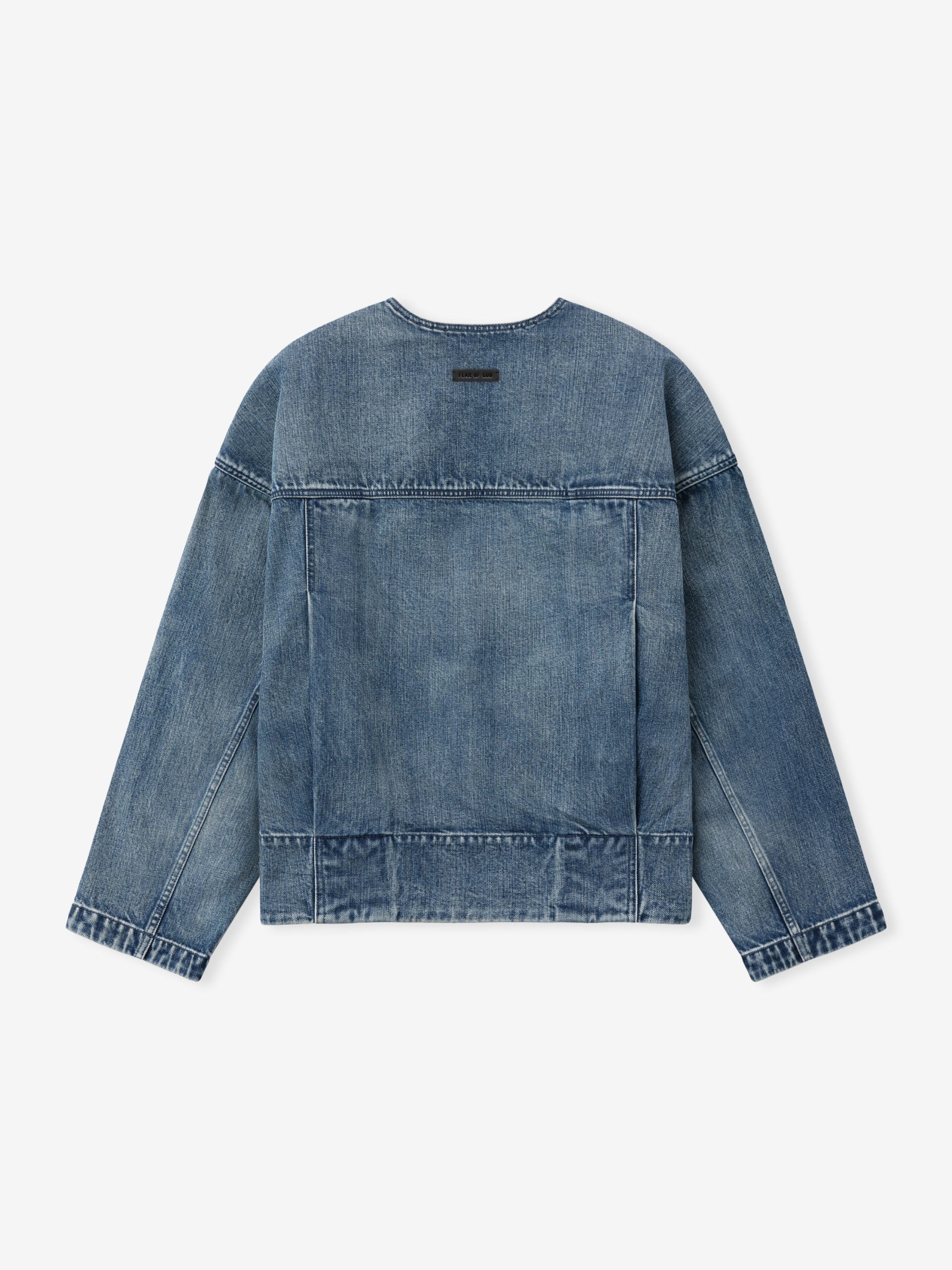 The casual lapelless jean jacket has unlined strong shoulders. curved sleeves. and curved back-yoke and pleats on the back. The piece is finished with the iconic Fear of God four-stitch label at the back collar.