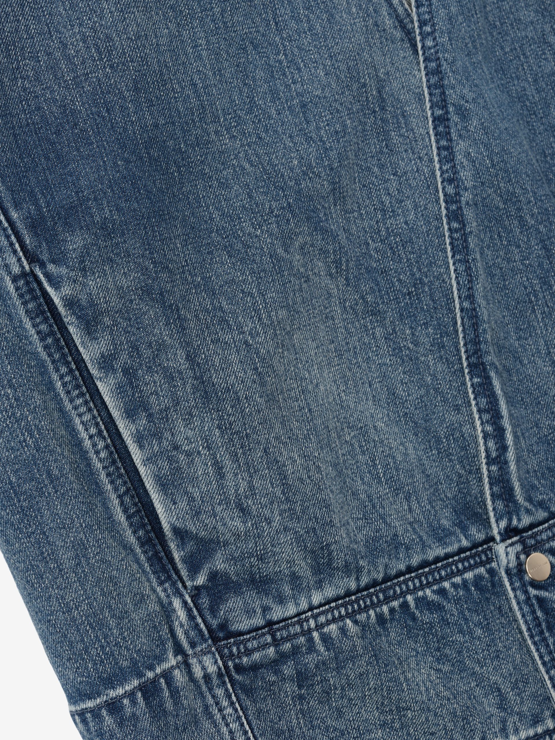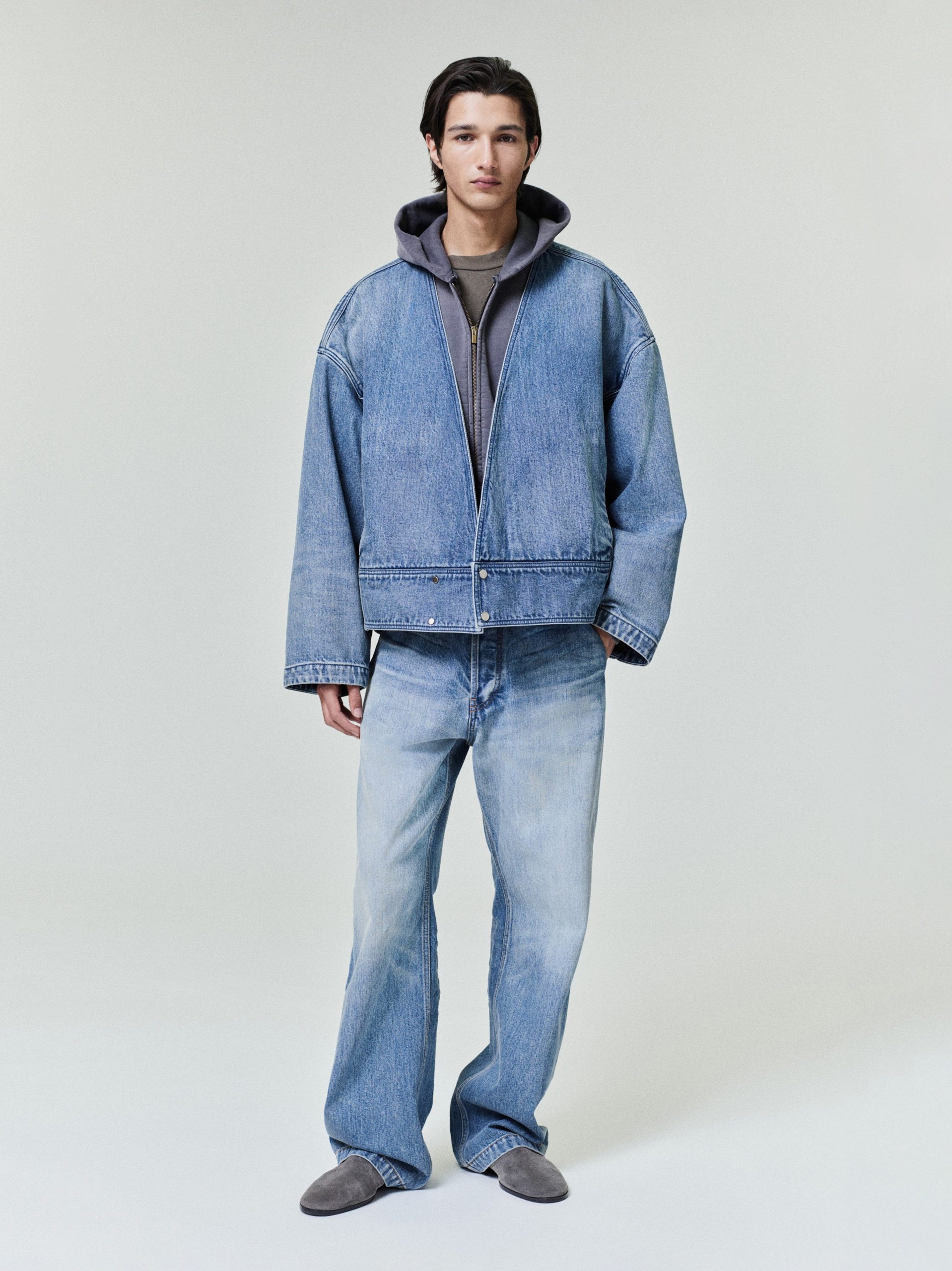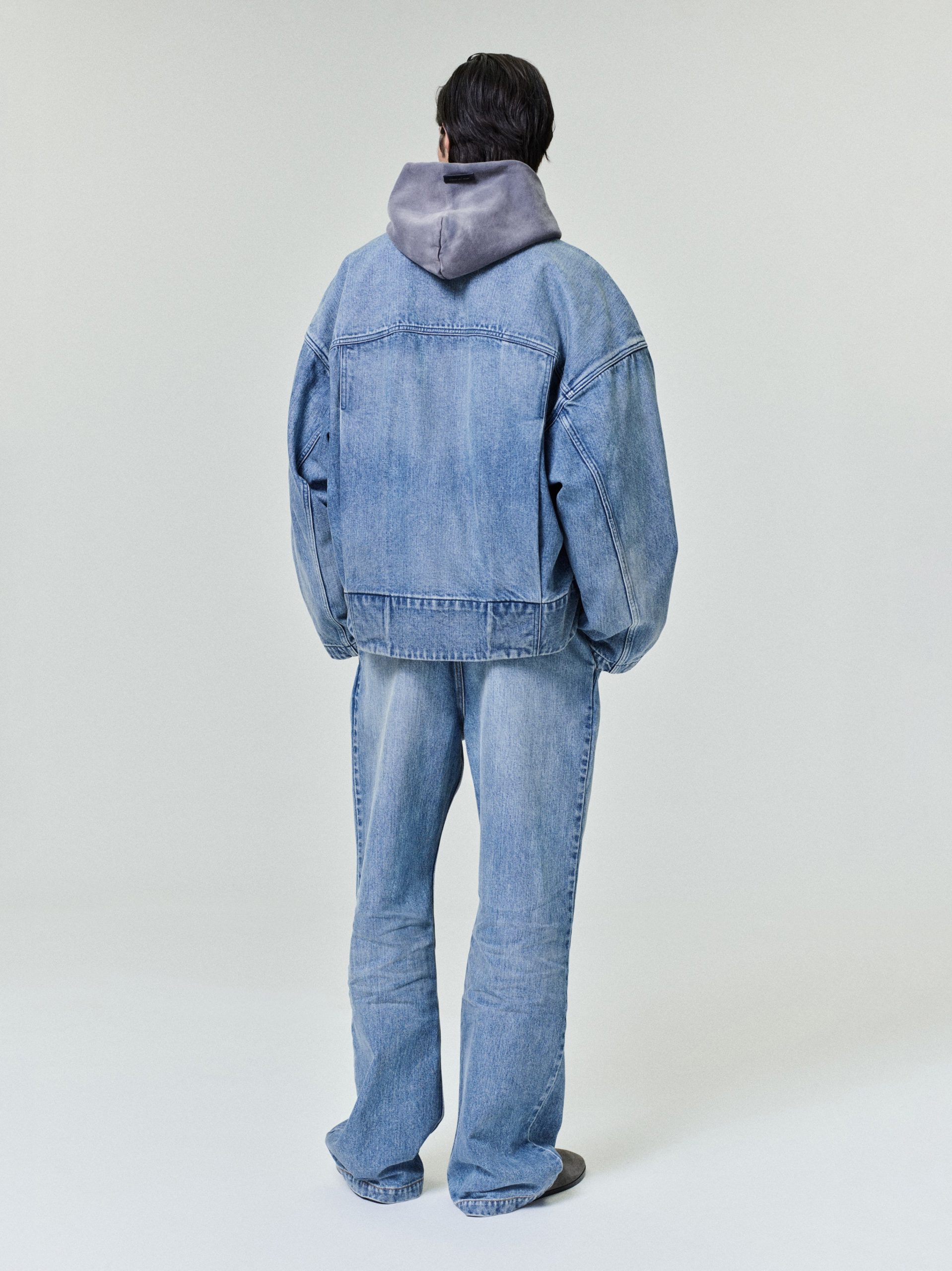 The casual lapelless jean jacket has unlined strong shoulders. curved sleeves. and curved back-yoke and pleats on the back. The piece is finished with the iconic Fear of God four-stitch label at the back collar.