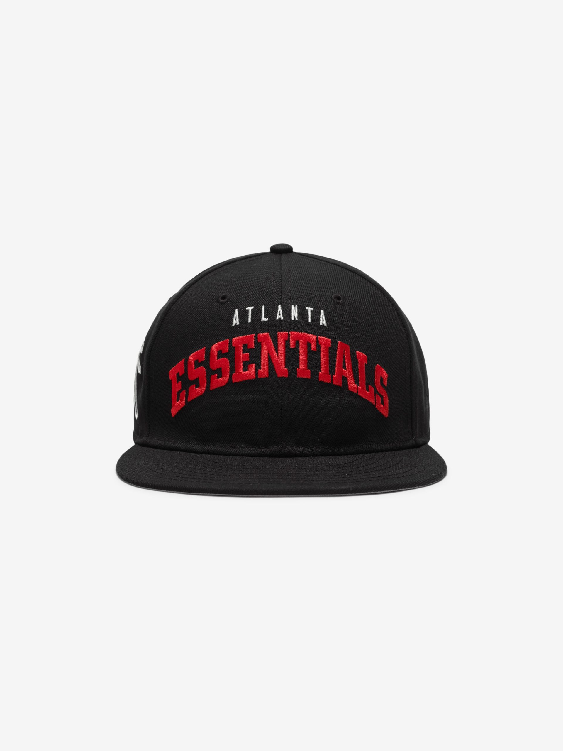 The Fear of God Essentials Falcons 9Fifty RC Snapback Cap features a Atlanta Essentials lockup. complemented by the official Atlanta Falcons logo at the back. The 9Fifty RC or Retro Crown is designed for a more vintage. casual feel. Additional features include an embroidered New Era logo on the side and an adjustable snapback closure at the rear.