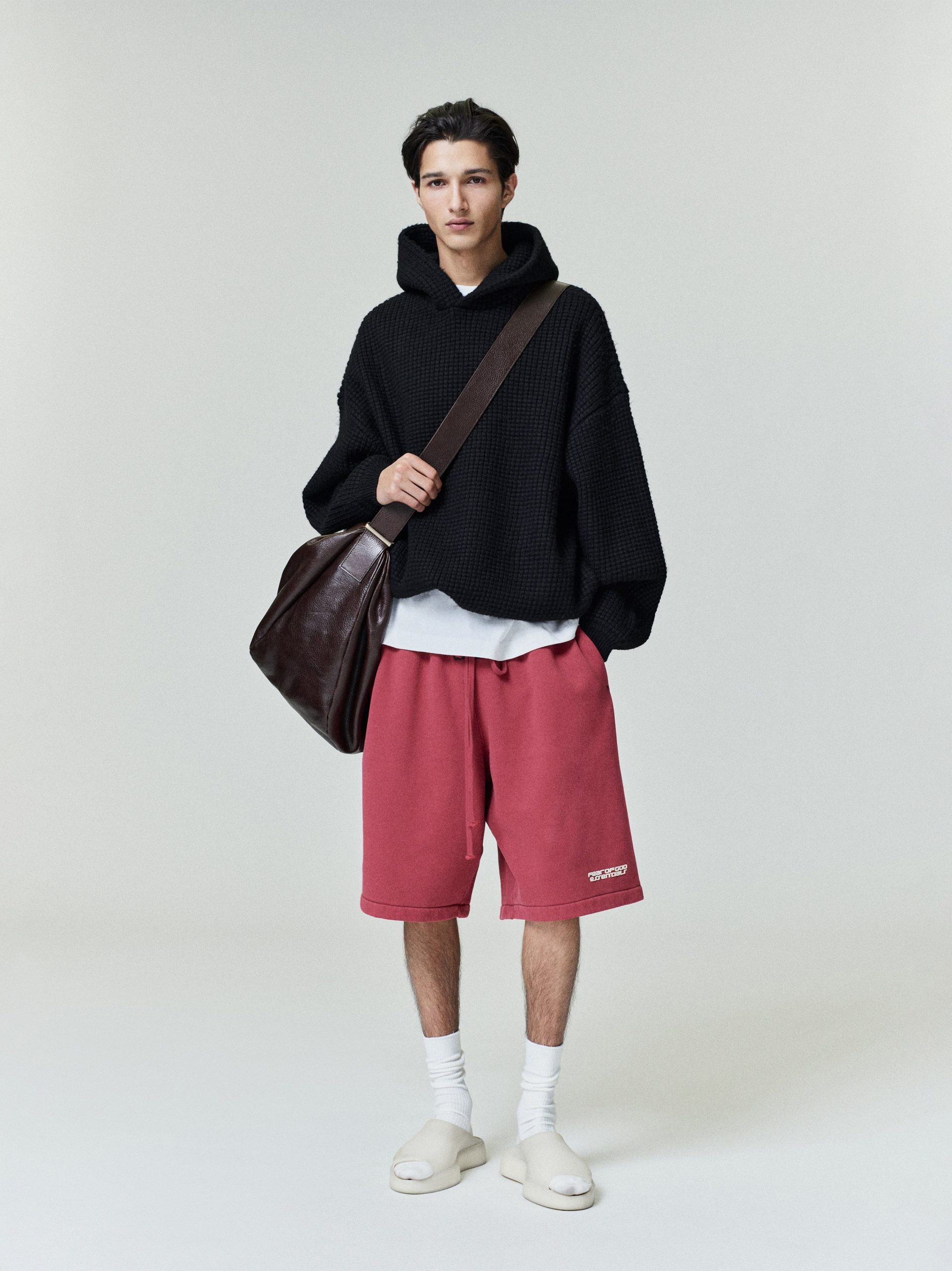 The Waffle Hoodie is knitted from a heavy waffle knit and cut in an oversized. ’90s-inspired silhouette with exaggerated proportions and dropped shoulders for a relaxed drape. Refined details include rib-knit cuffs. and waist hem. finished with a Fear of God Essentials rubberized label stitched on the hood.