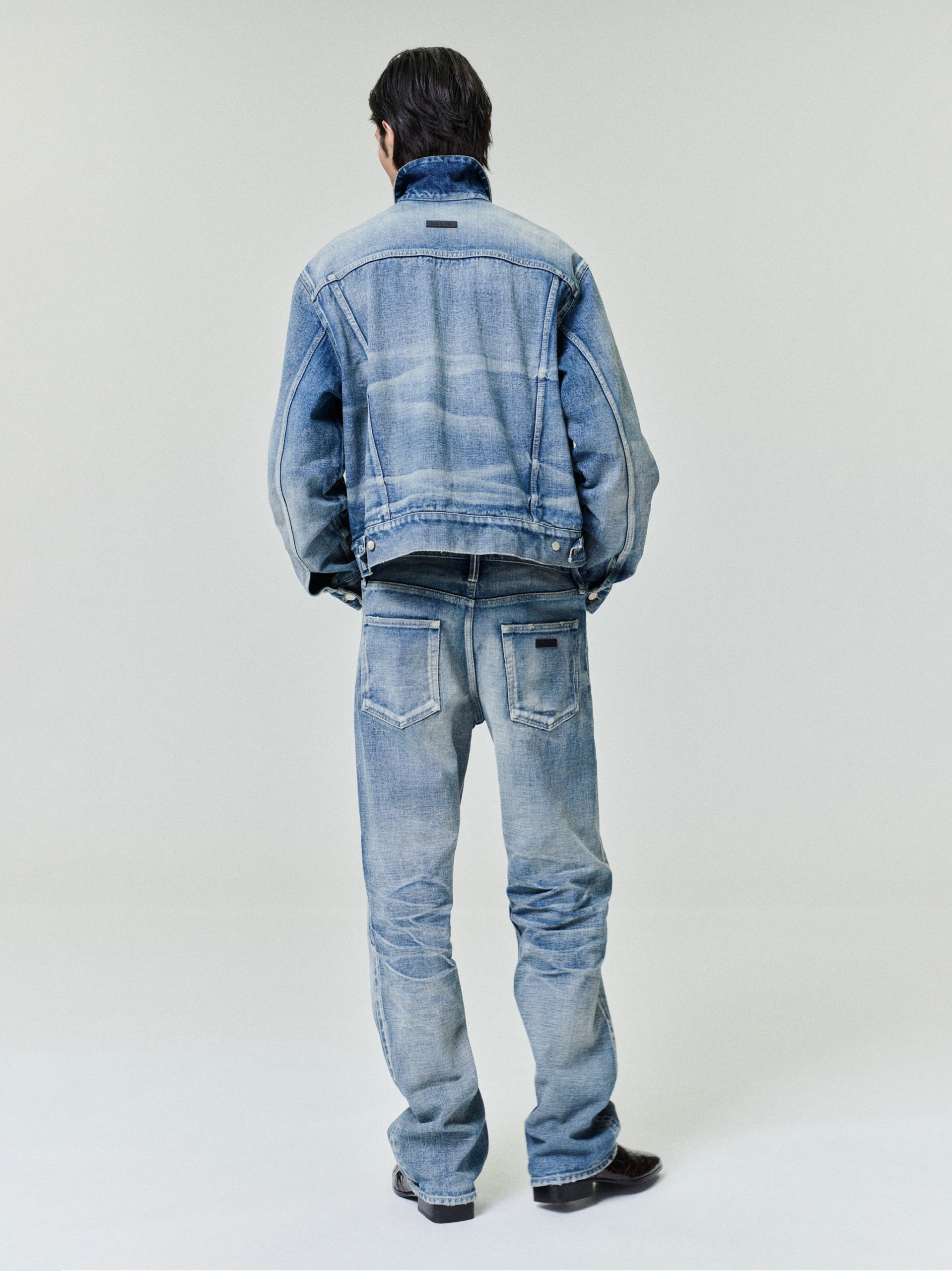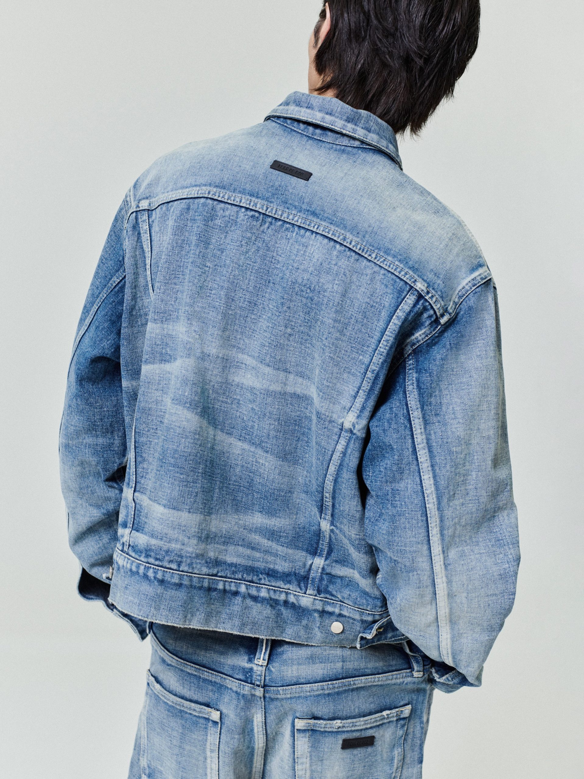 The Classic Trucker Jacket is crafted in Japan a vintage washed selvedge denim. The classic fit jacket features two chest pockets. tabs on the waistband. and Fear of God metal shank buttons. The iconic Fear of God 4-stitch label is on center back.