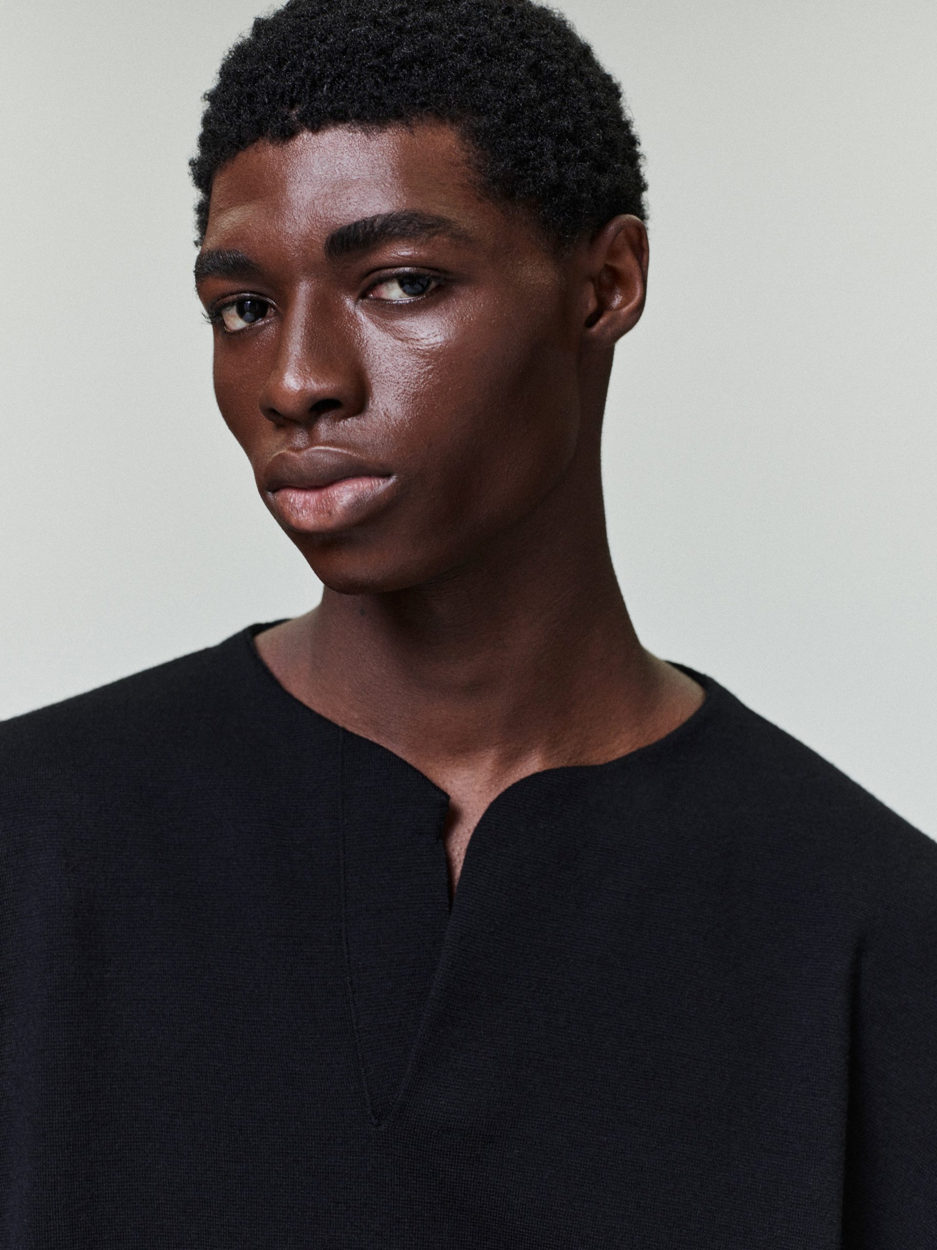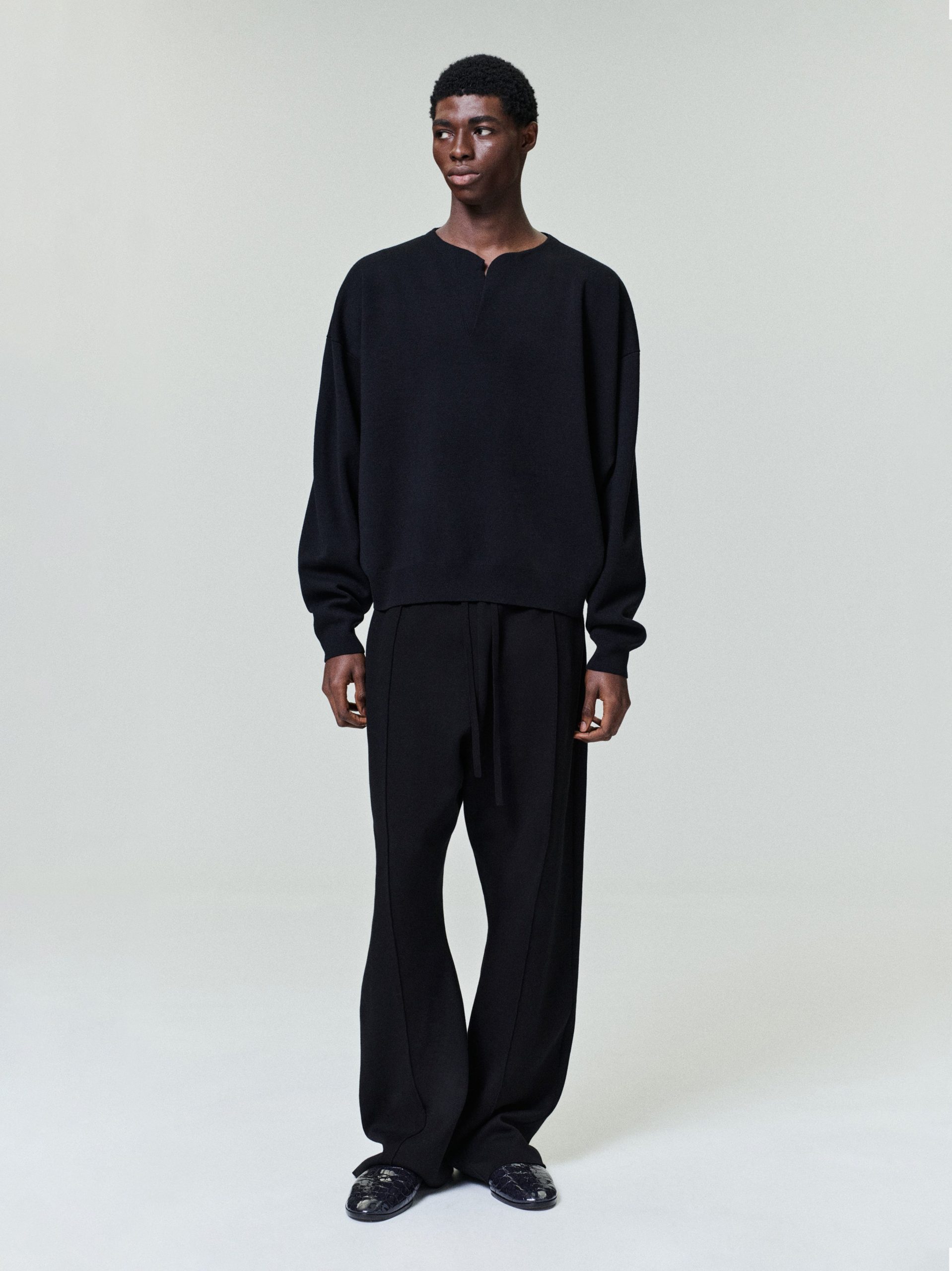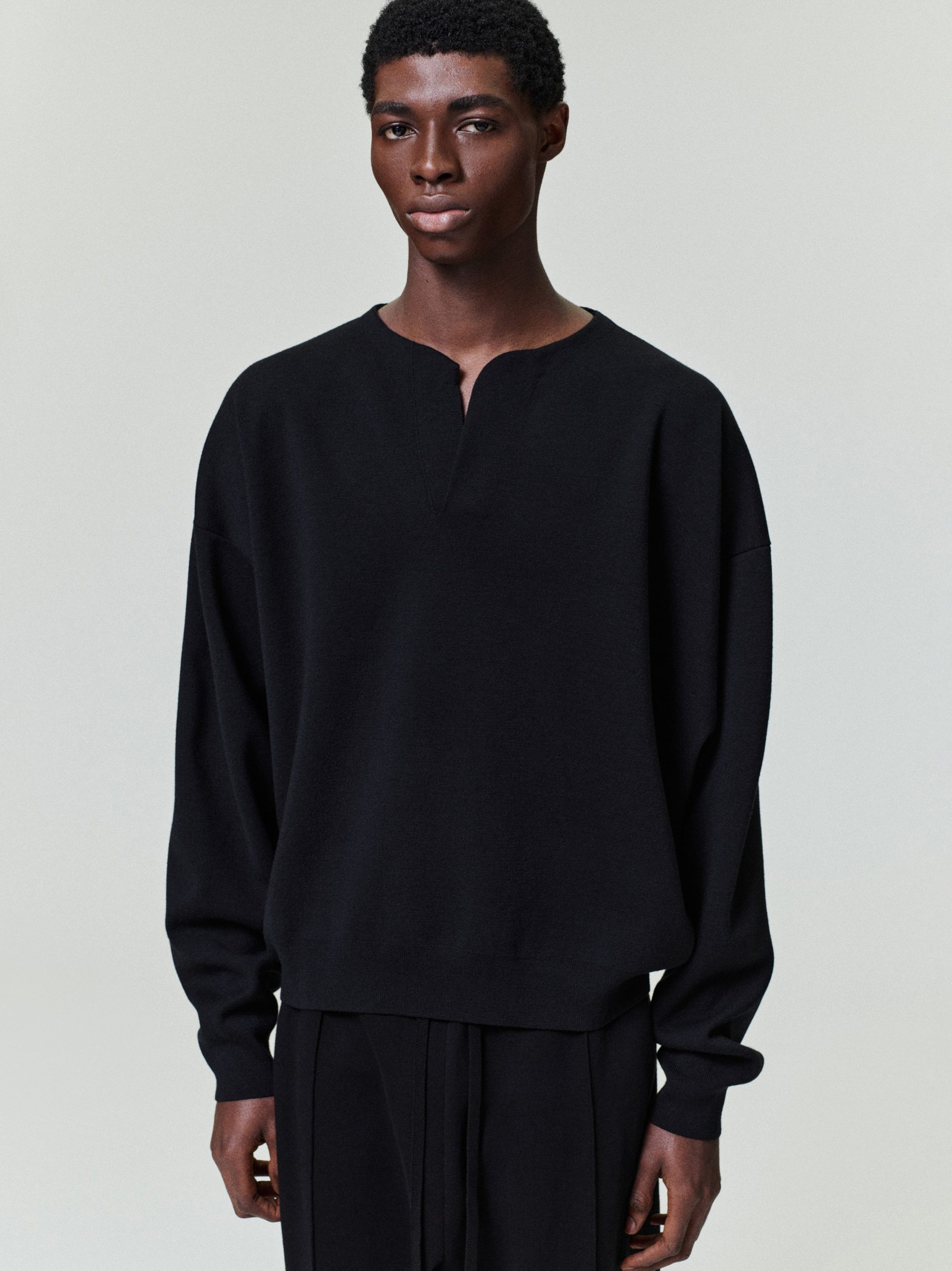 The Crewneck Sweater is crafted in Italy from Light merino Milano stitch knit. Designed with a relaxed fit. the long-sleeve henley sweater features a mesh stitch construction and is finished with ribbed cuffs and hem for structure.