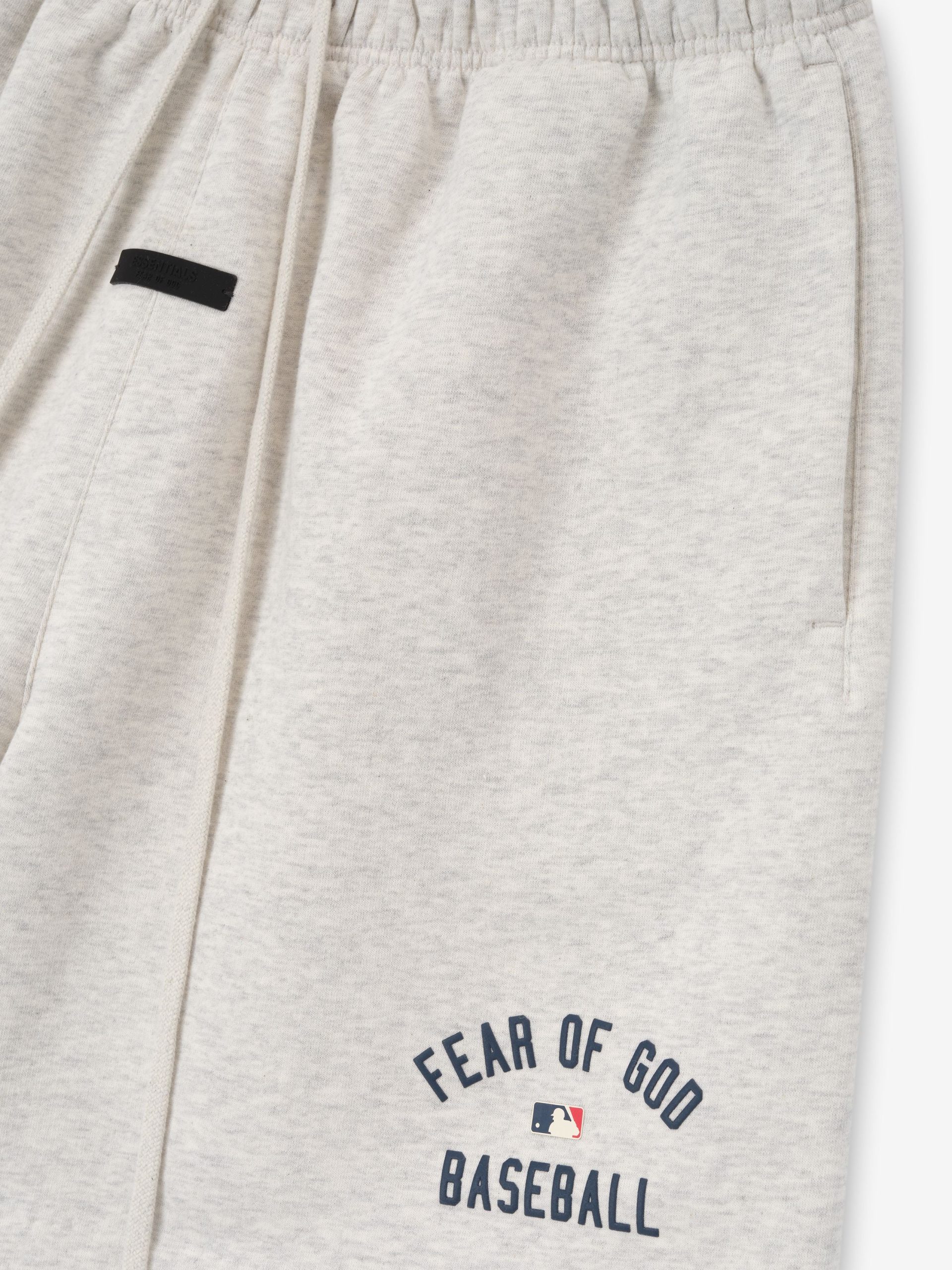 The MLB Classic Sweatshort is made in 380gsm core fleece to provide body and structure to a relaxed fit. A Fear of God Baseball puffer print lockup with MLB logo are branded on leg. Additional details include an encased elastic waistband with elongated drawstrings. and side pockets. A Fear of God Essentials rubberized label is stitched on the center front.