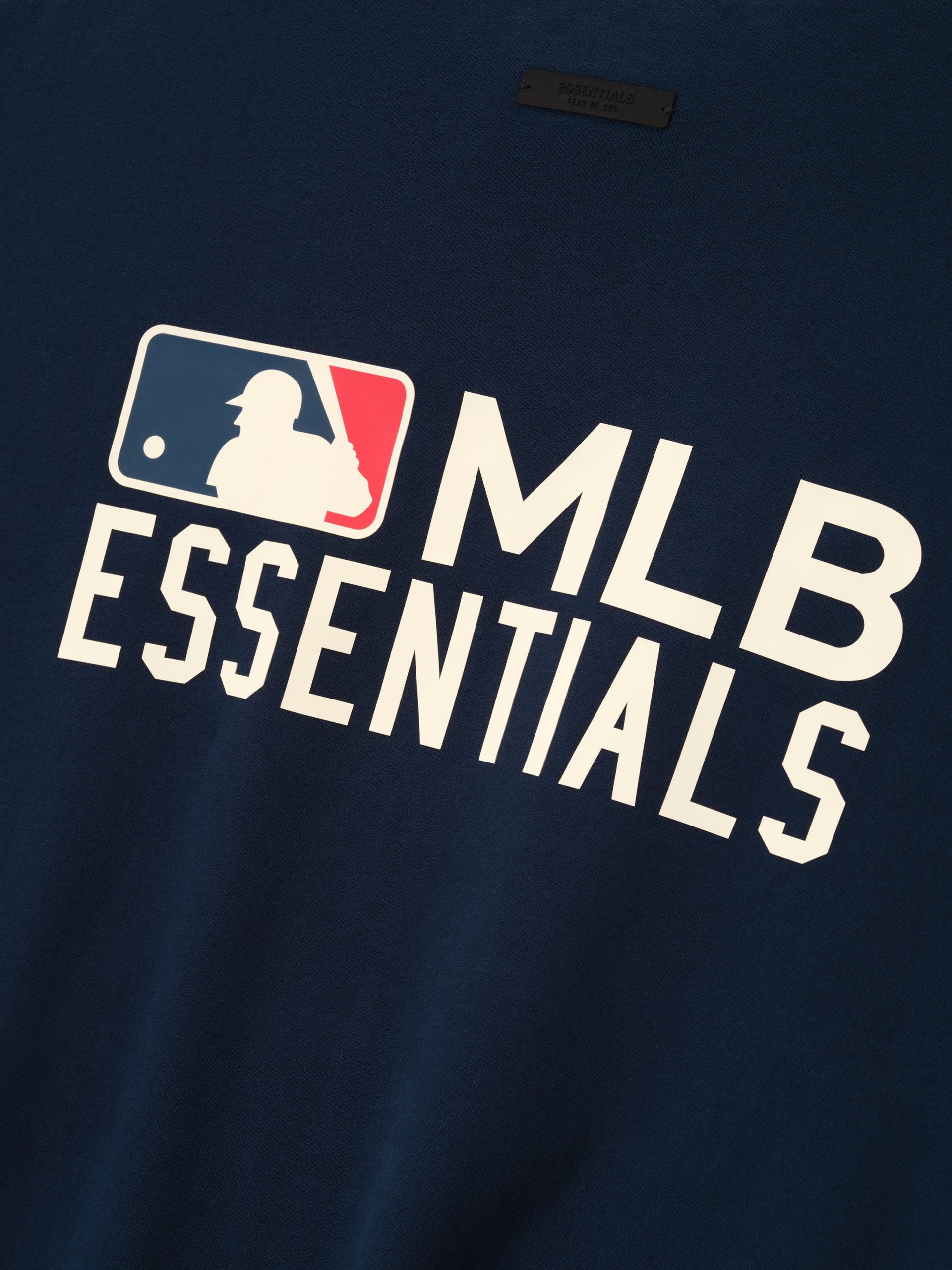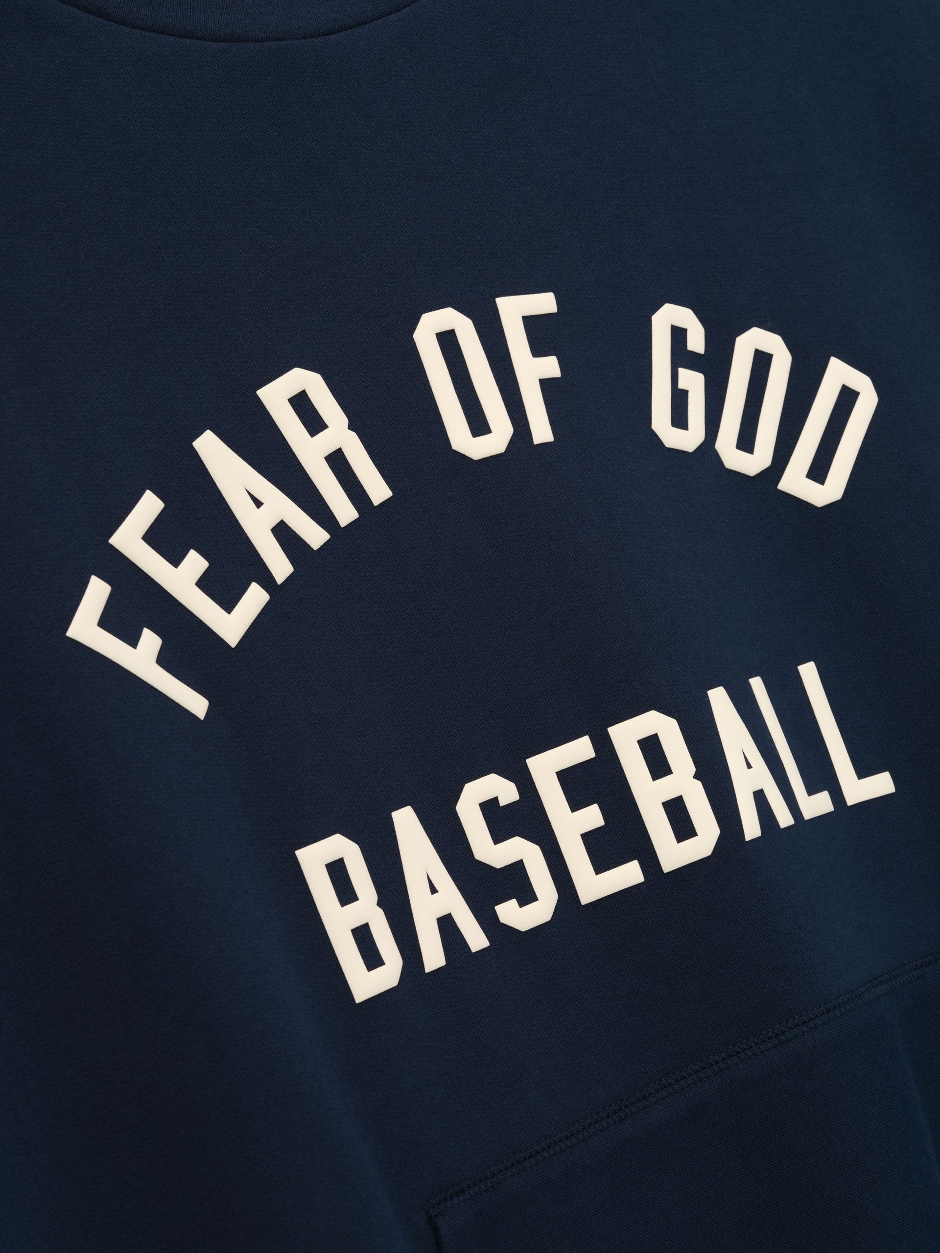 The MLB Sport Crewneck is crafted from core fleece. offering an elevated balance of softness. structure. and lasting comfort. Cut in a relaxed sport fit. it drapes with more ease through the body and extended length compared to the Essentials classic silhouette. The front features a bold puffer-print graphic reading Fear of God Baseball. while the back is finished with the MLB Essentials lockup. Additional details include a kangaroo pocket. rib-knit collar. cuffs and hem. The signature rubberized Fear of God Essentials label accents the hood.