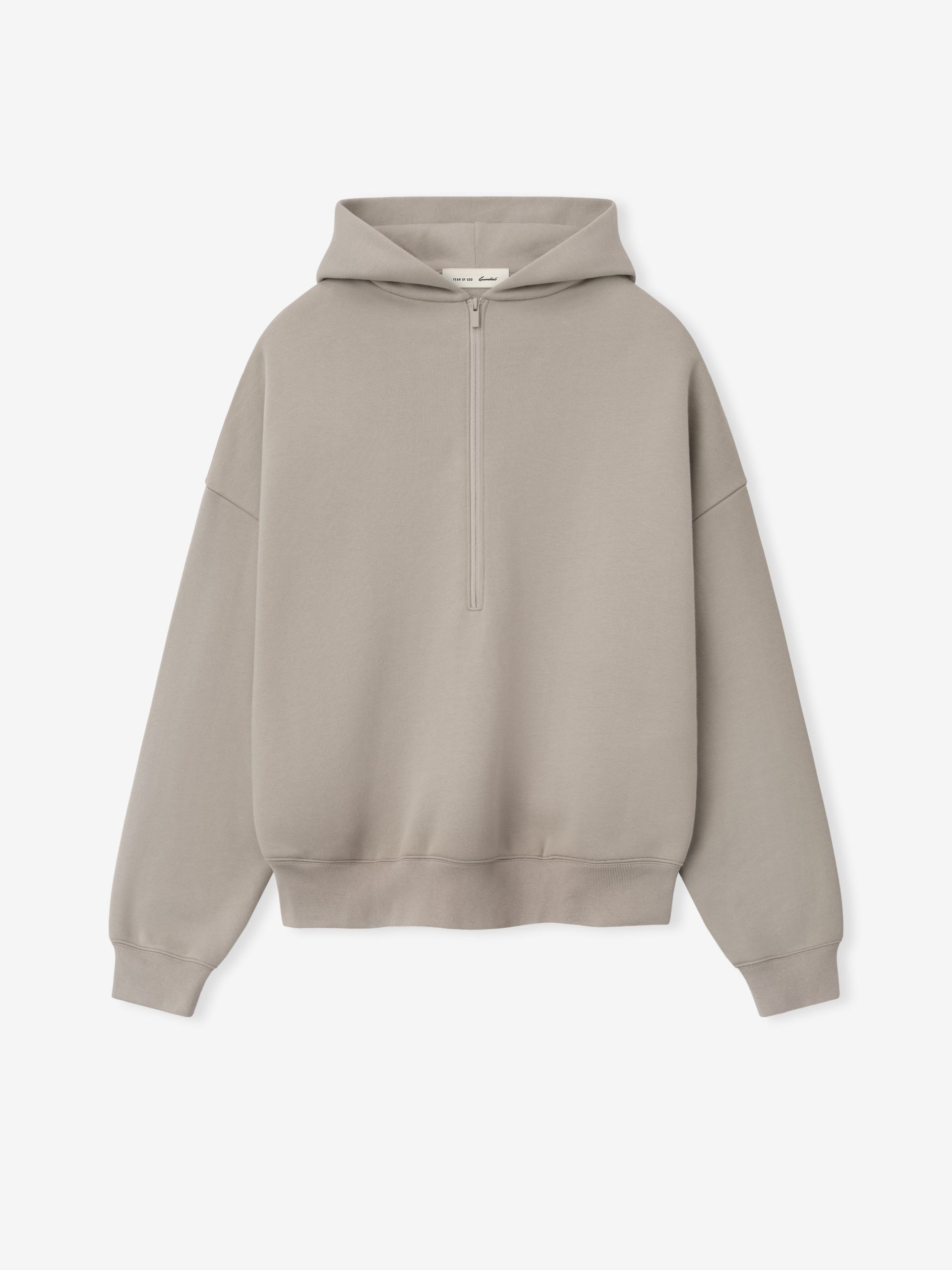The Property Lounge Half Zip Hoodie is made from a heavy 480GSM core fleece. The Essentials Property logo is branded on the back in a satin stitch. Details include a half zip front. double-layer hoodie. side pockets. rib-knit cuffs. waist-hem. and an Essentials signature label on the hood edge.