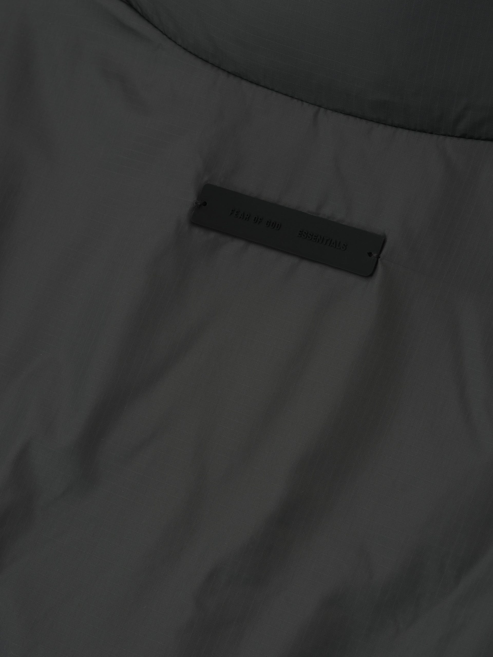 The Puffer Jacket is crafted from ripstop nylon. offering a matte appearance with water repellant properties. The piece is detailed with a 3D Essentials graphic on the chest to enhance its relaxed. rounded silhouette. Functional details include a high neck. side pockets. full zip front. elasticized piping on the cuffs and waist hem. and bungee toggles at the waist hem for adjustable styling. A Fear of God Essentials rubberized label stitched at the back collar.