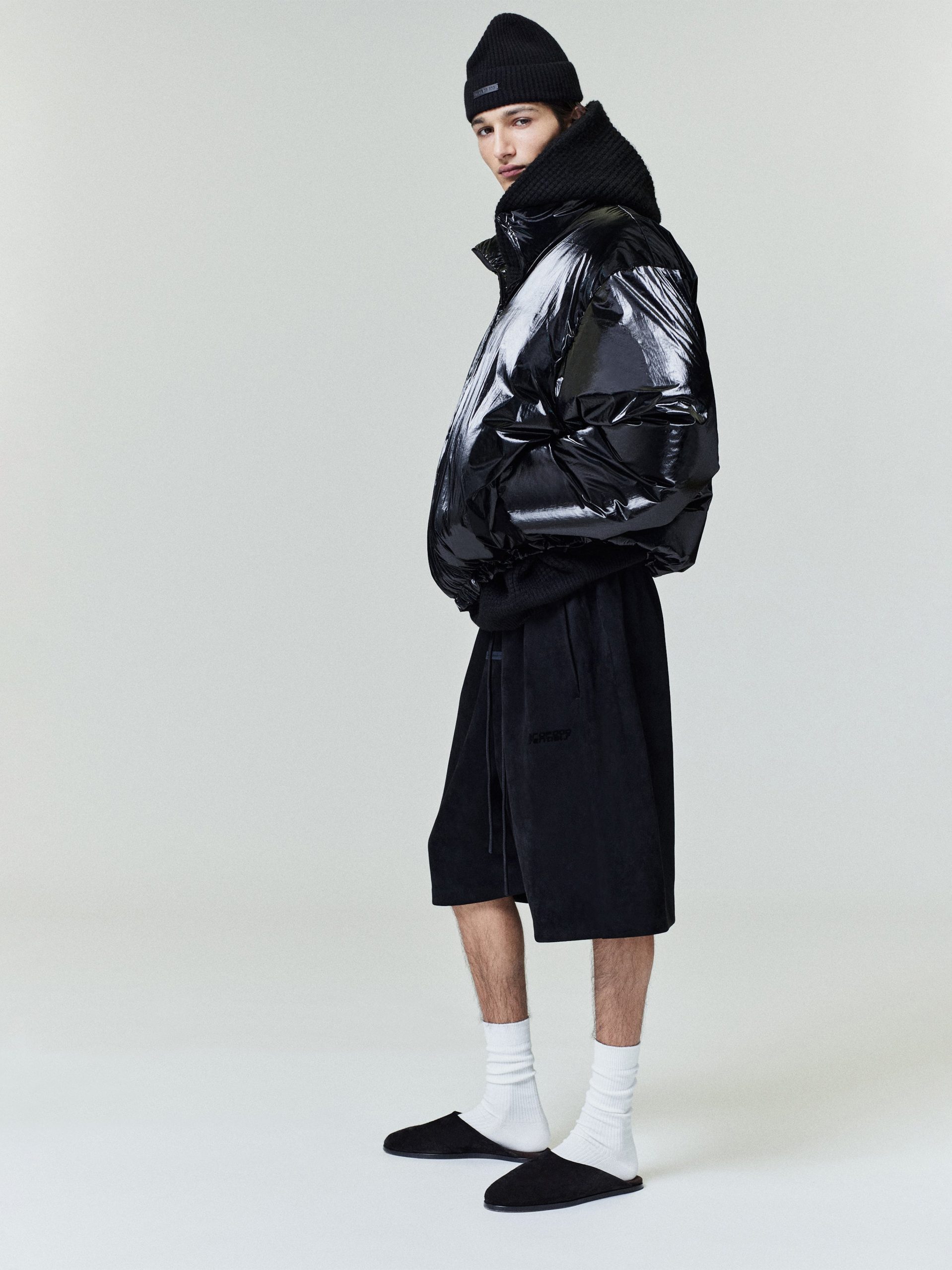 The Puffer Jacket is crafted from ripstop nylon. offering a high gloss appearance with water repellant properties. The piece is detailed with an metallic 3M-printed Essentials graphic on the sleeve to enhance its relaxed. rounded silhouette. Functional details include a high neck. side pockets. full zip front. elasticized piping on the cuffs and waist hem. and bungee toggles at the waist hem for adjustable styling. A Fear of God Essentials rubberized label stitched at the center front.