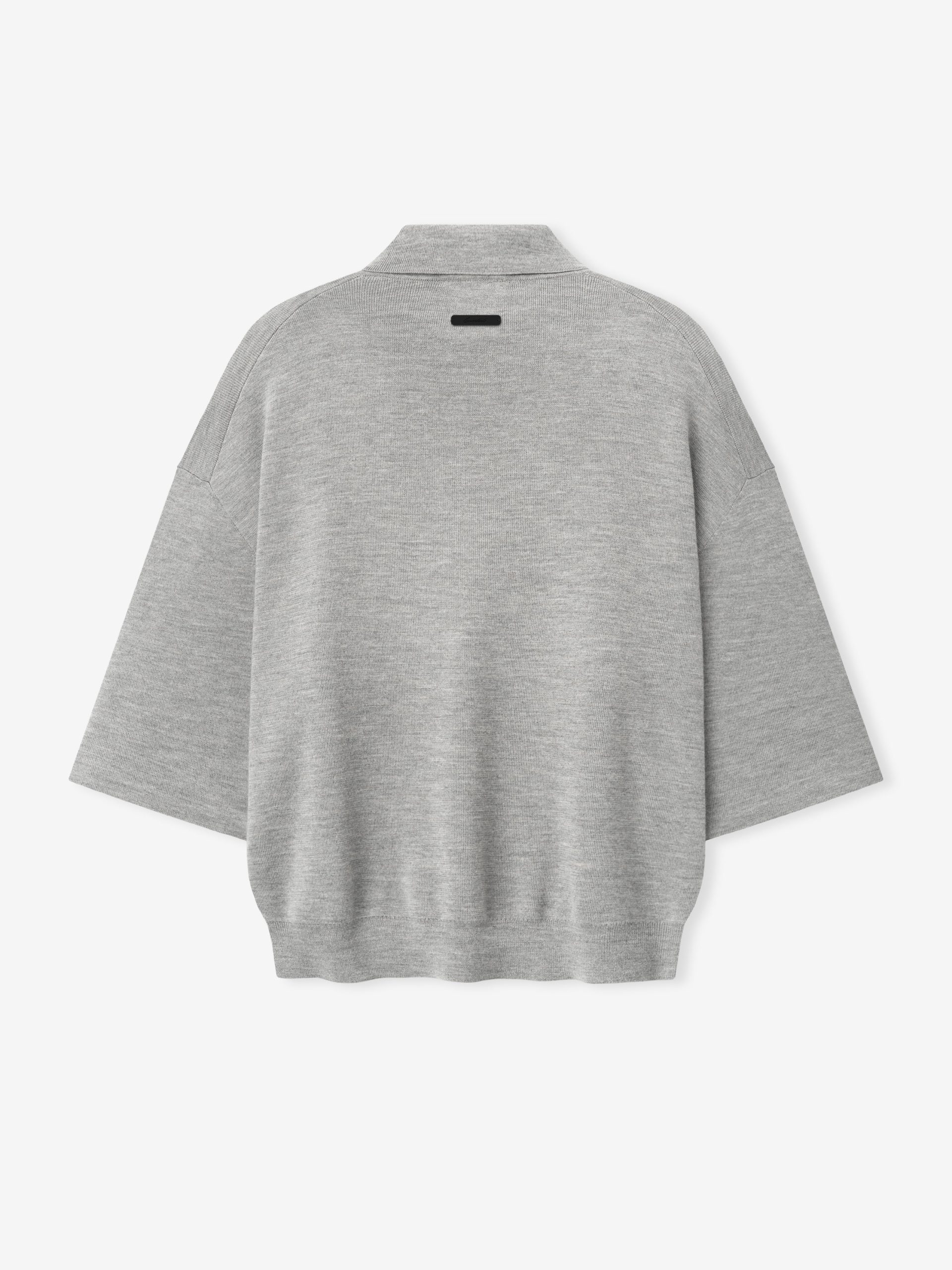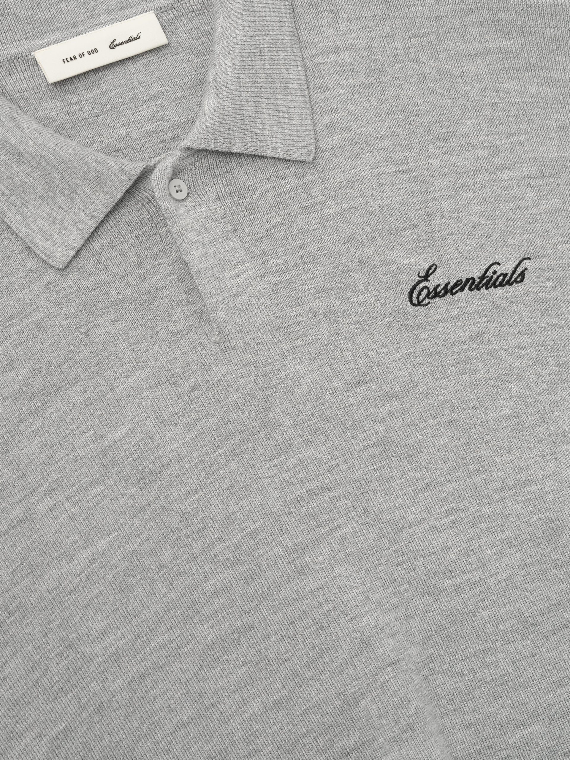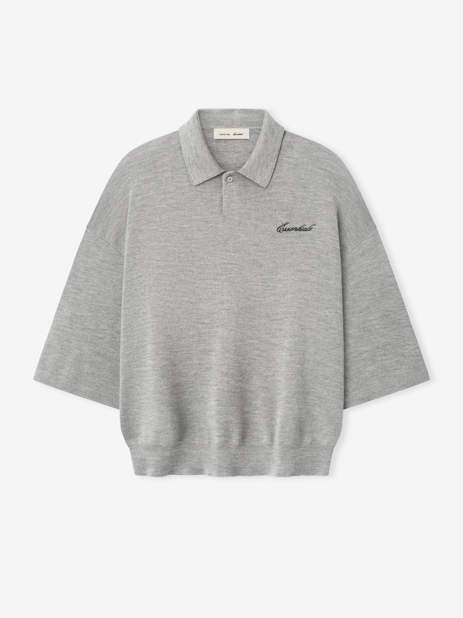 The Signature 3/4 Sleeve 90s Polo is knitted from a heavy merino knit. Its relaxed silhouette with 3/4 sleeves is defined by an Essentials signature script embroidered front. Details include a covered Henley placket. rib-knit polo collar and waist-hem. An Essentials signature label is at the back collar.