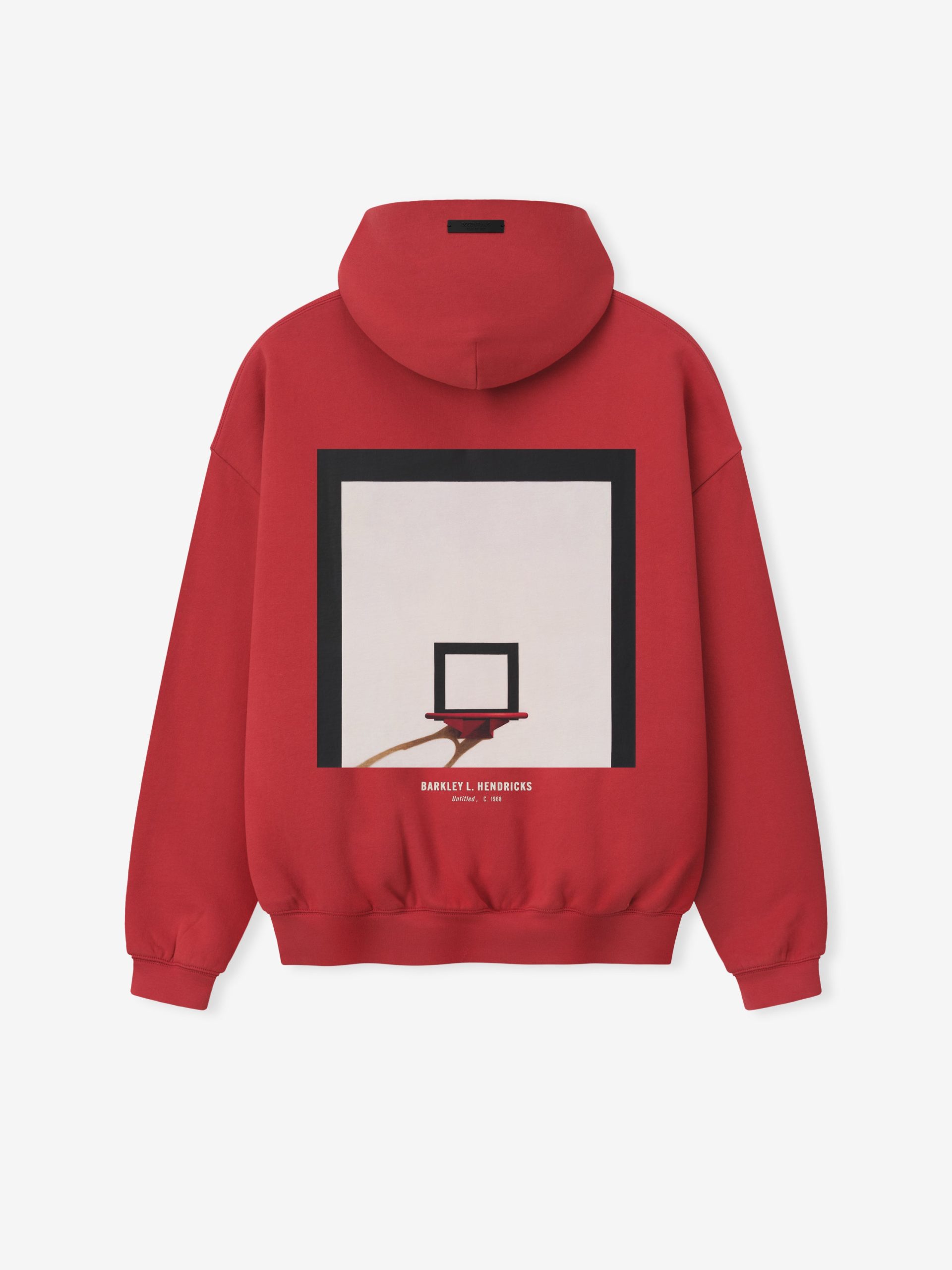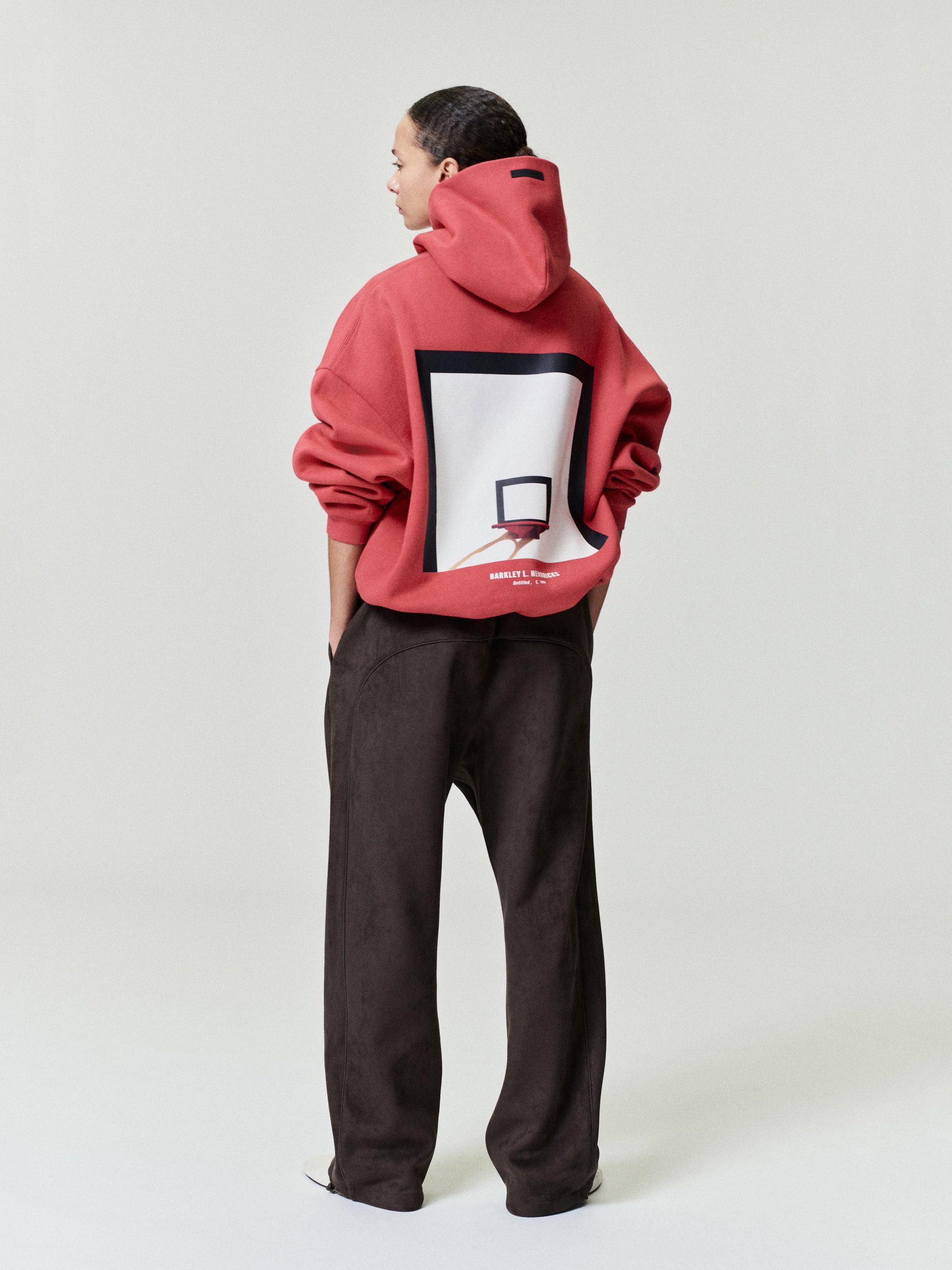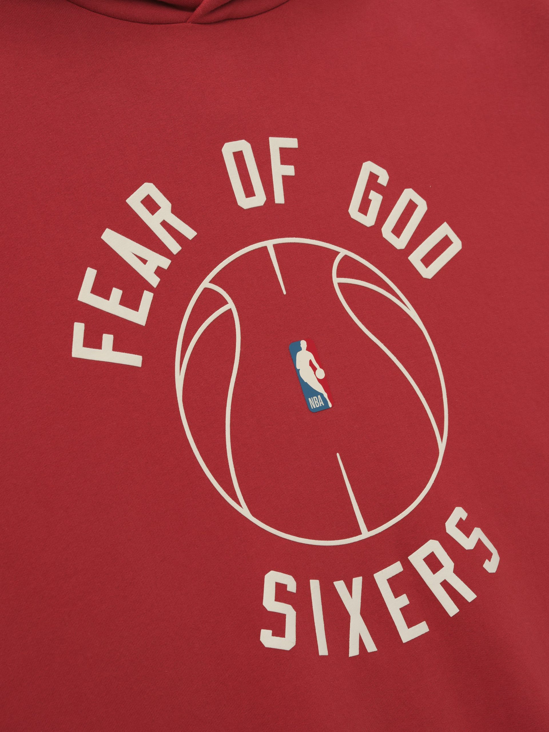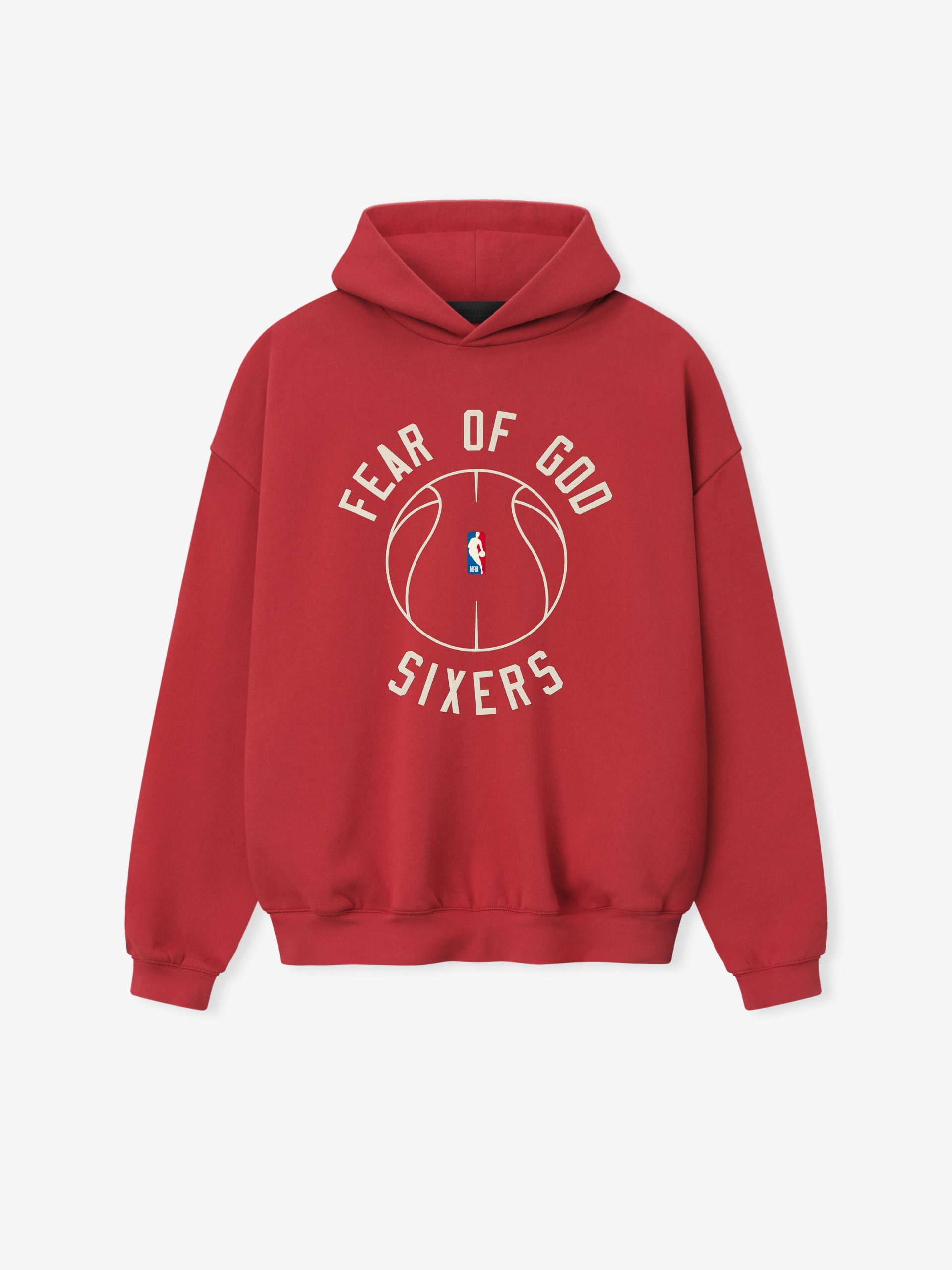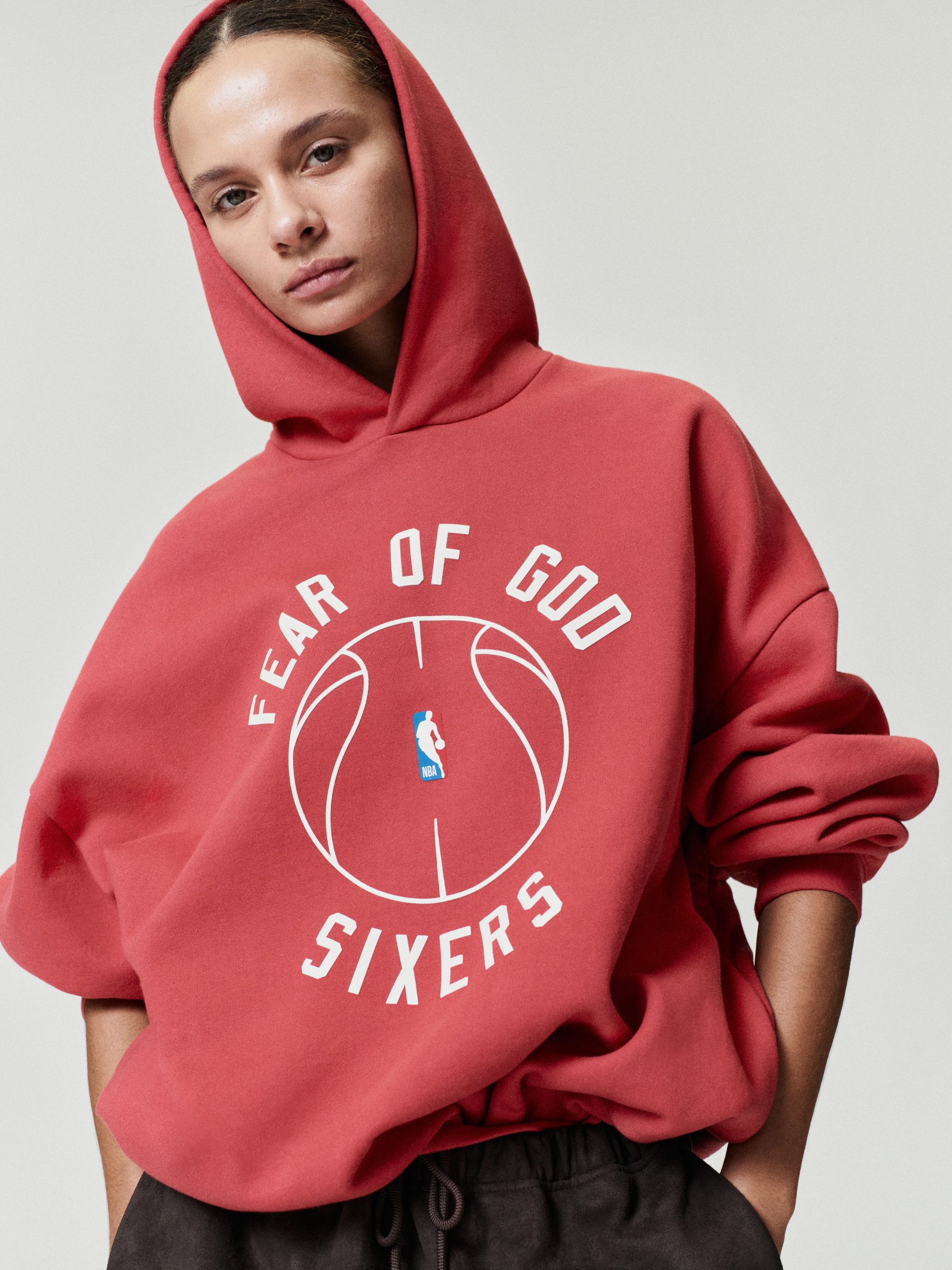 The Sixers x Barkley Hendricks 90s Hoodie is crafted from 520GSM heavyweight cotton fleece and designed in a relaxed. 90s-inspired silhouette. The front features a puff-printed FEAR OF GOD SIXERS graphic paired with the official NBA logo. while the back showcases Barkley Hendricks’ iconic Basketball Series artwork rendered in a 3D print that captures the texture and emotion of his brushstrokes. Finishing details include side pockets. rib-knit cuffs and waist hem. and a Fear of God Essentials label on the hood.