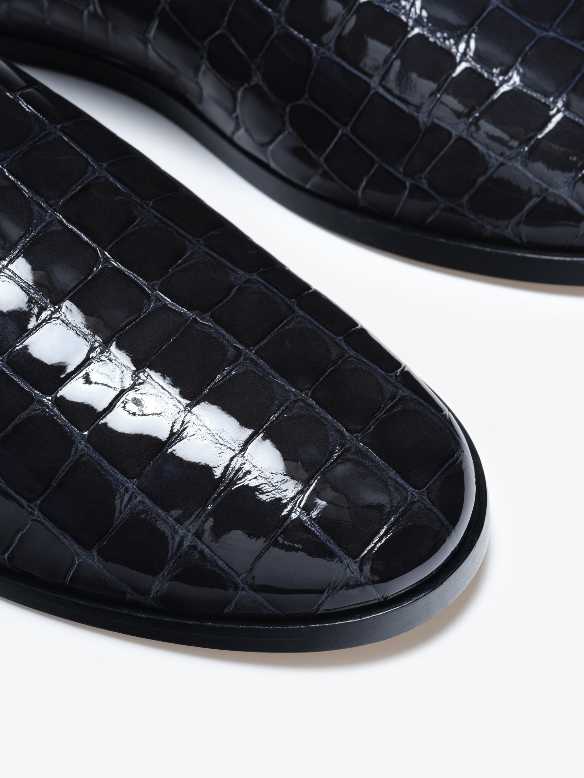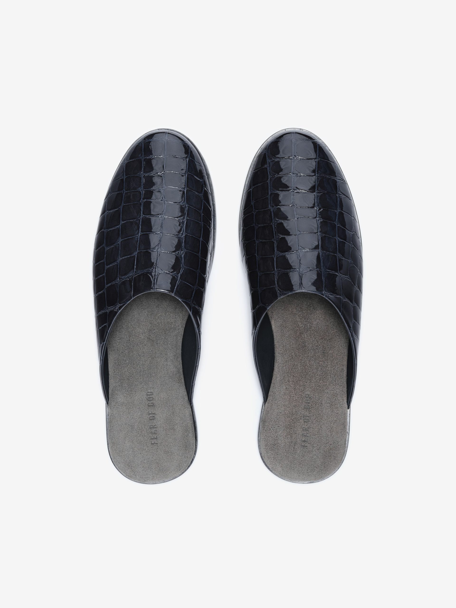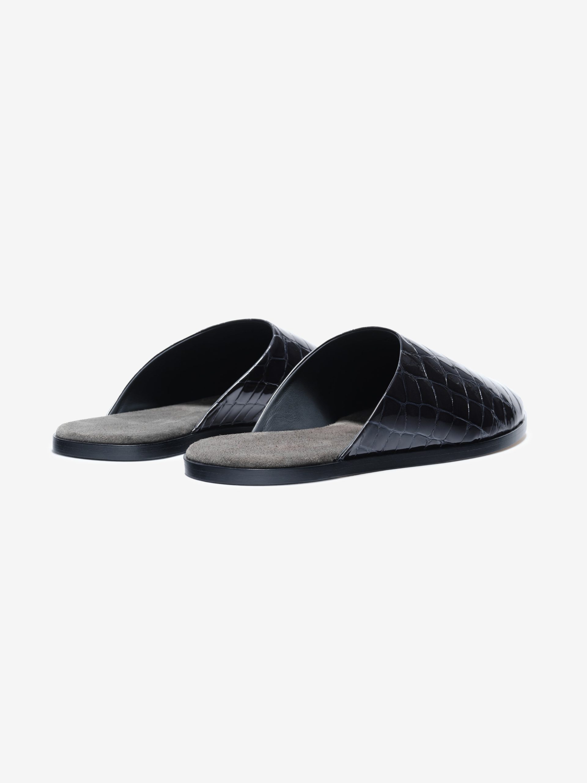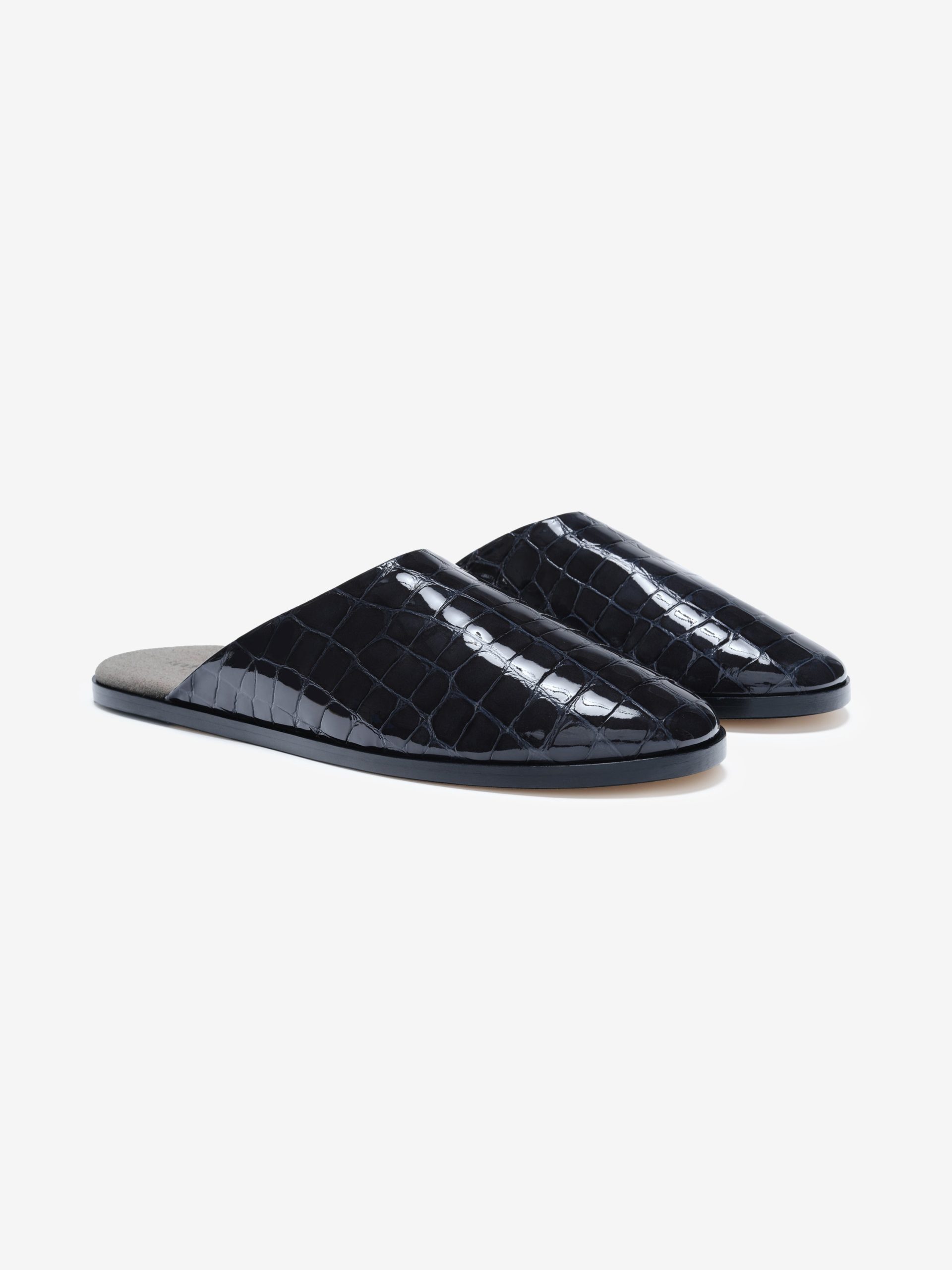The Slipper is a crafted in Italy from croc-printed leather with a handmade wooden sole. The slip-on backless style is designed with a contemporary silhouette.