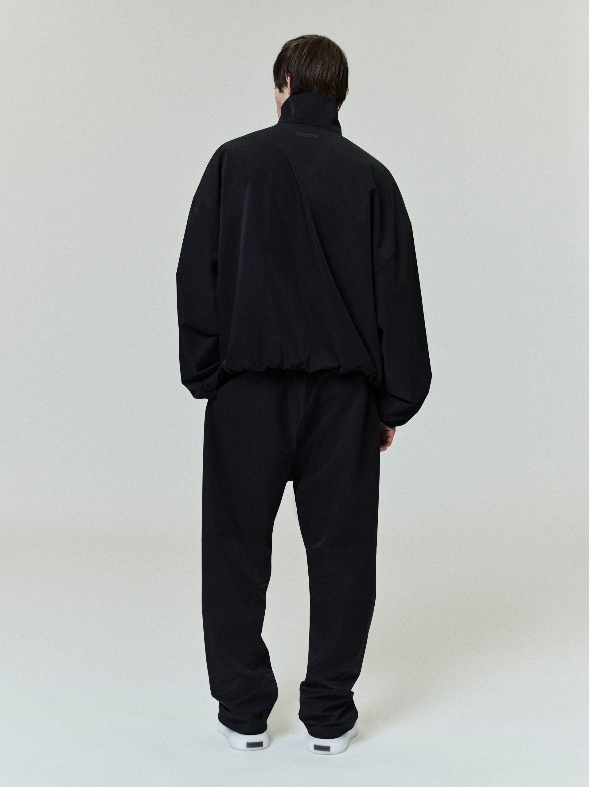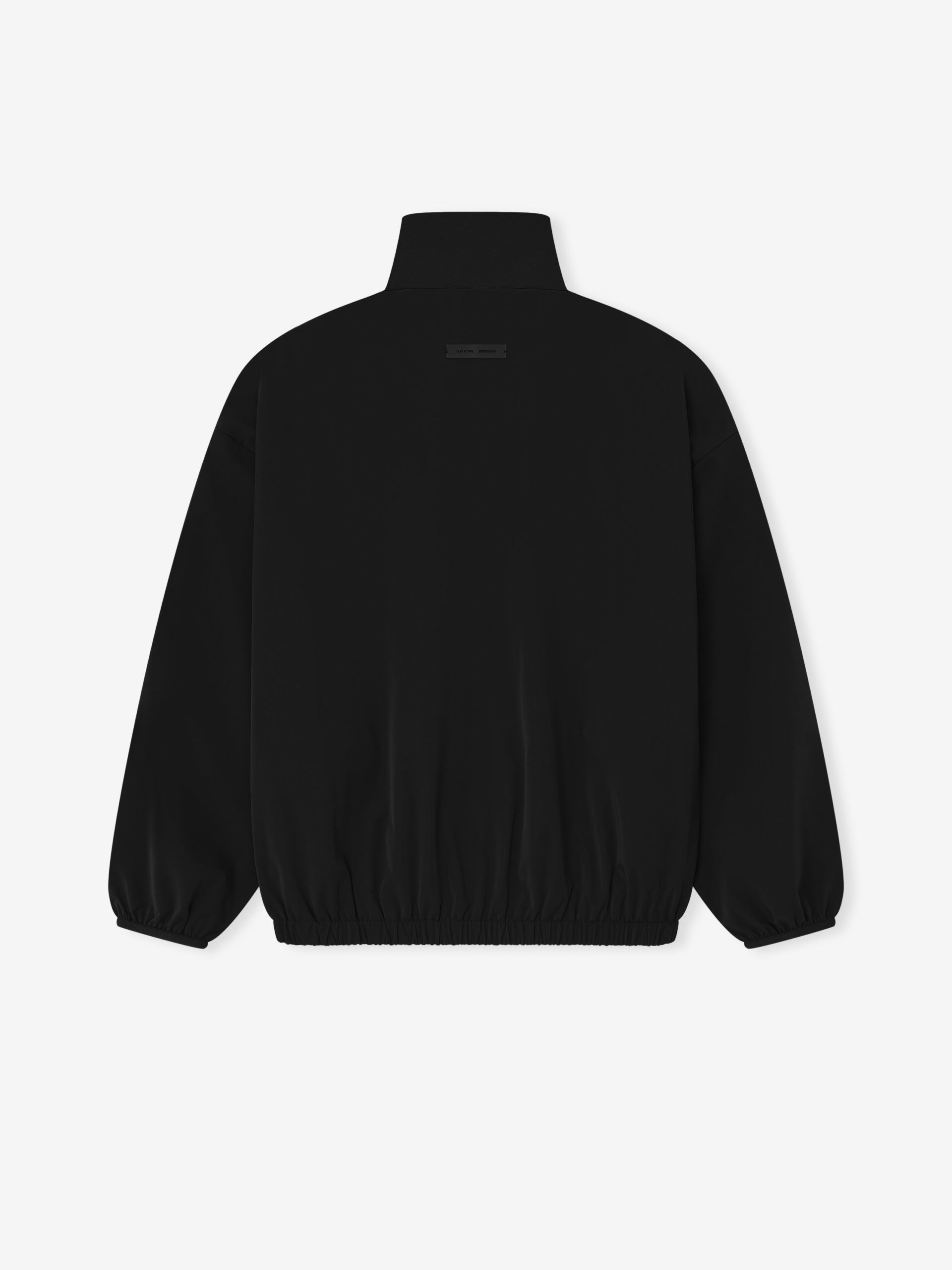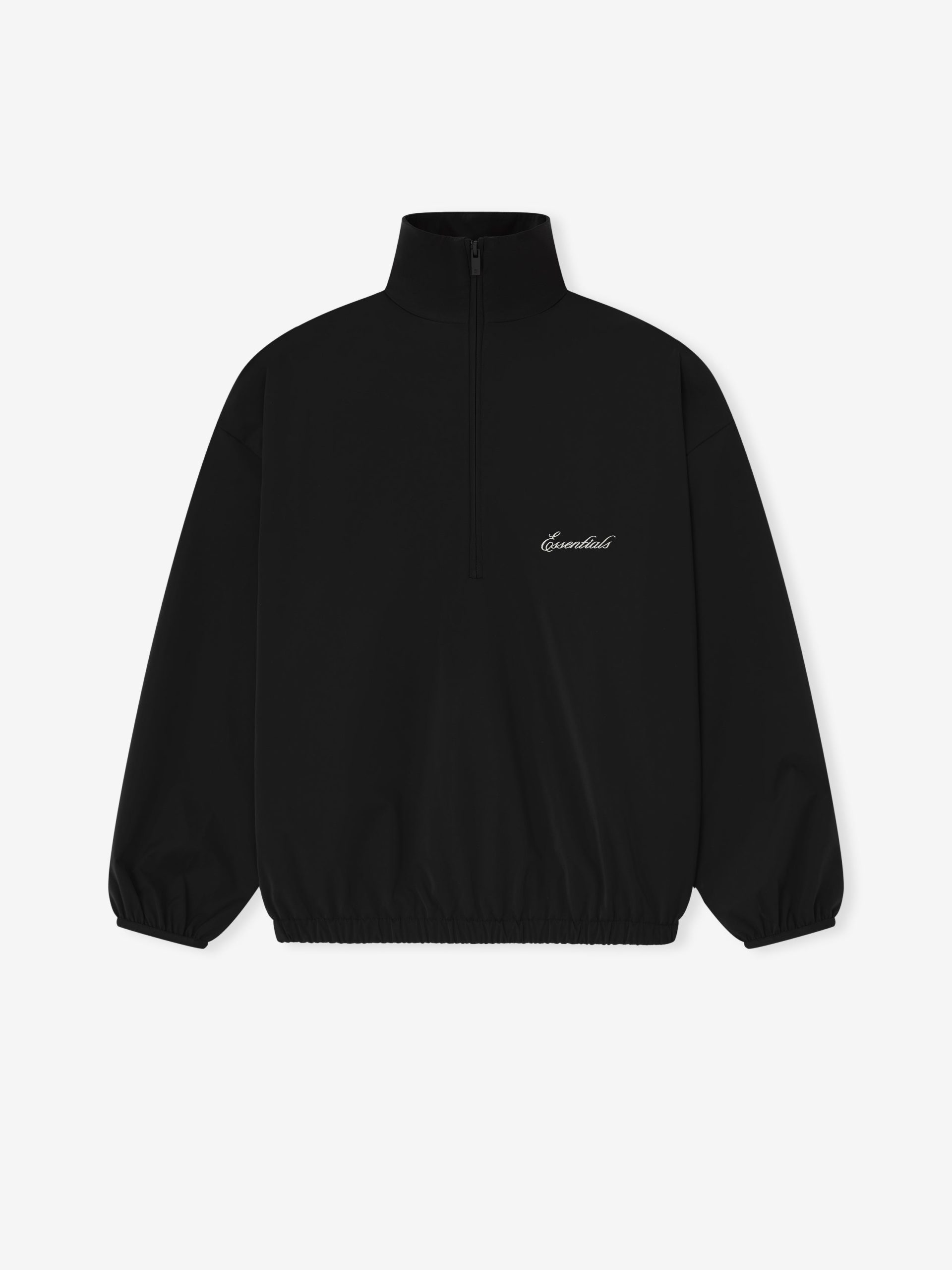 The Sport Half Zip is made in a 100% recycled polyester with a perforated lining . The mockneck pullover has a front half zip. with a relaxed fit for layering. The branding is minimalist. showcasing an embroidered Essentials script logo on the chest and a rubberized label from Fear of God Essentials at the back collar.