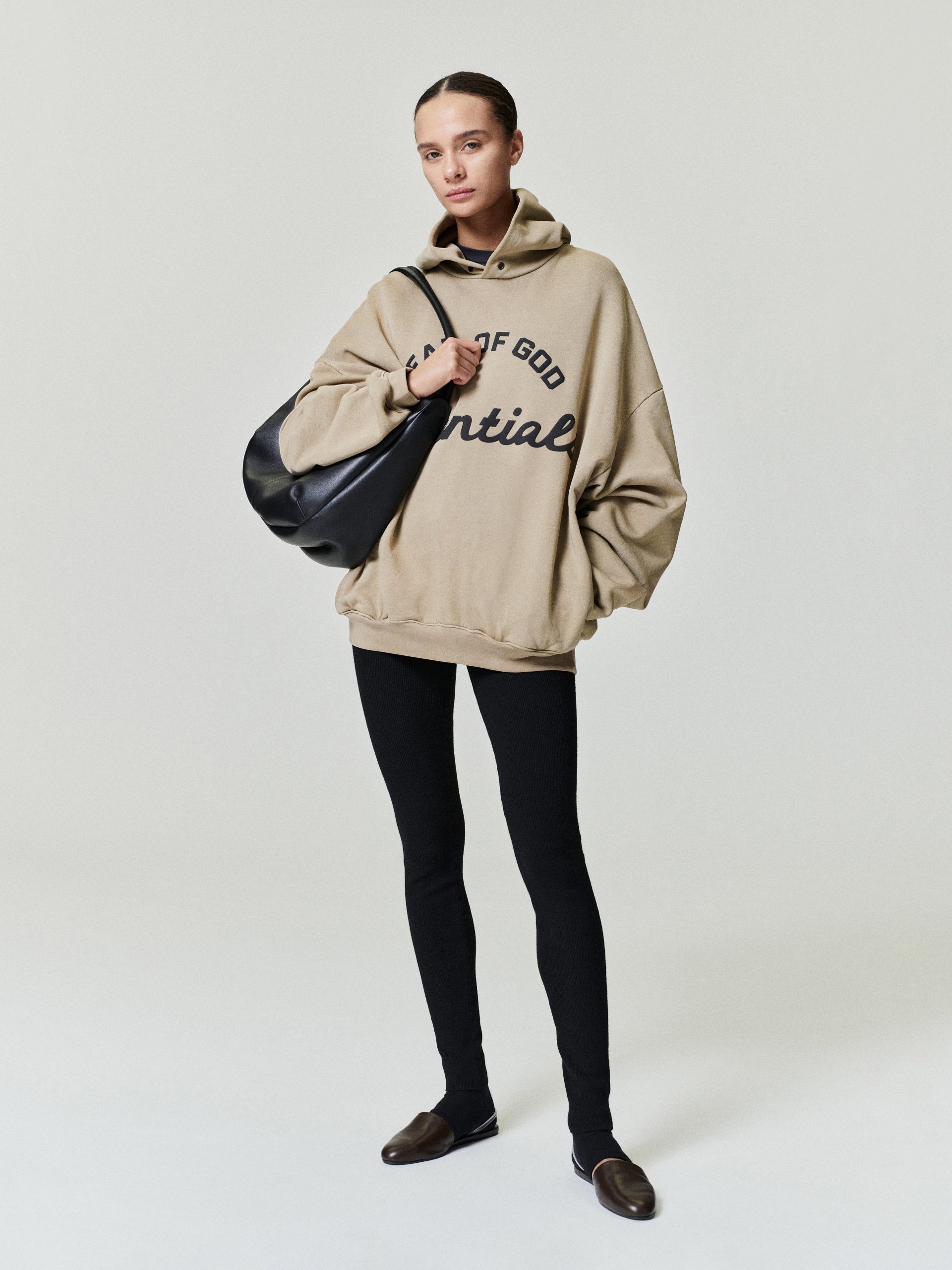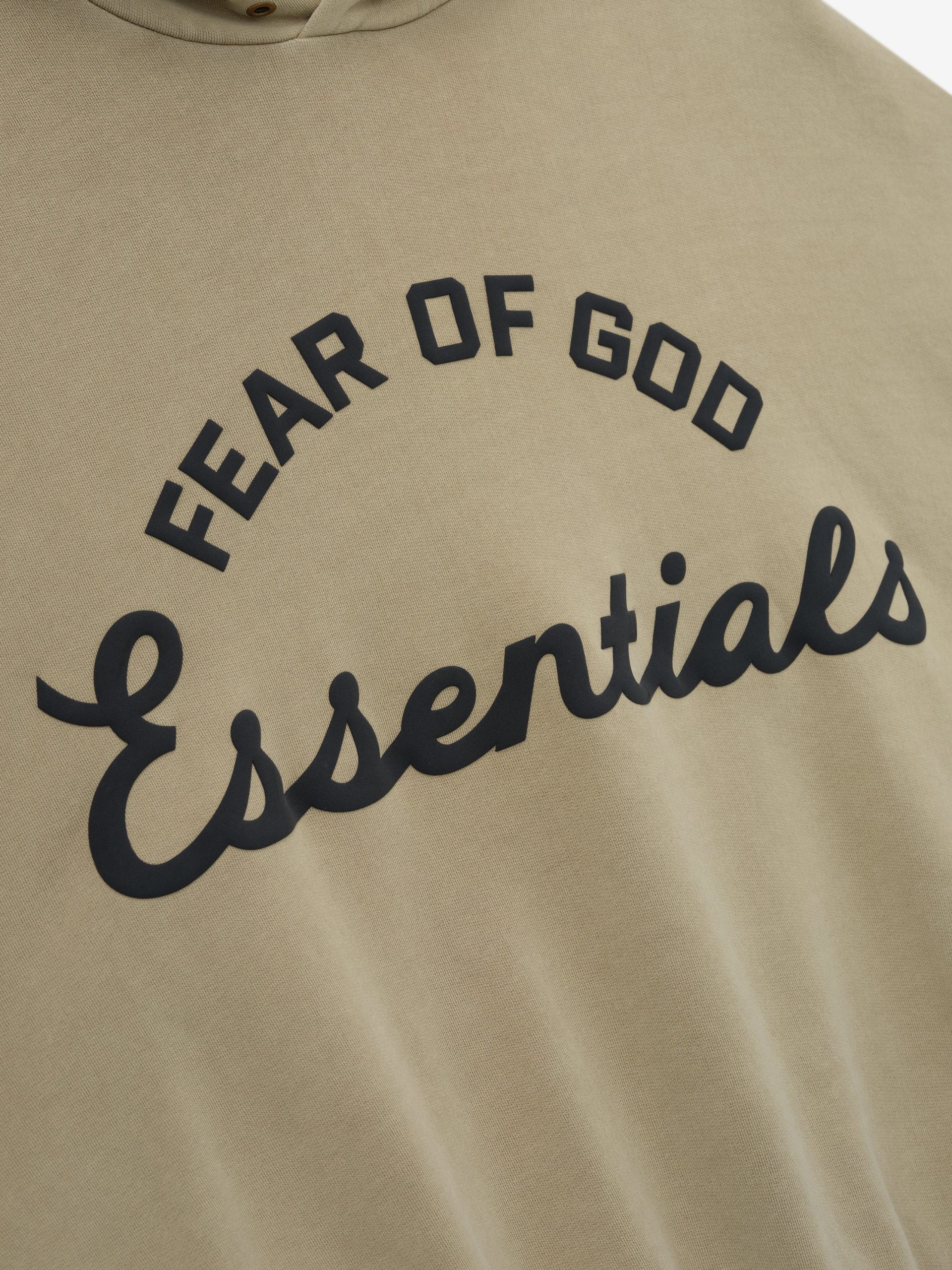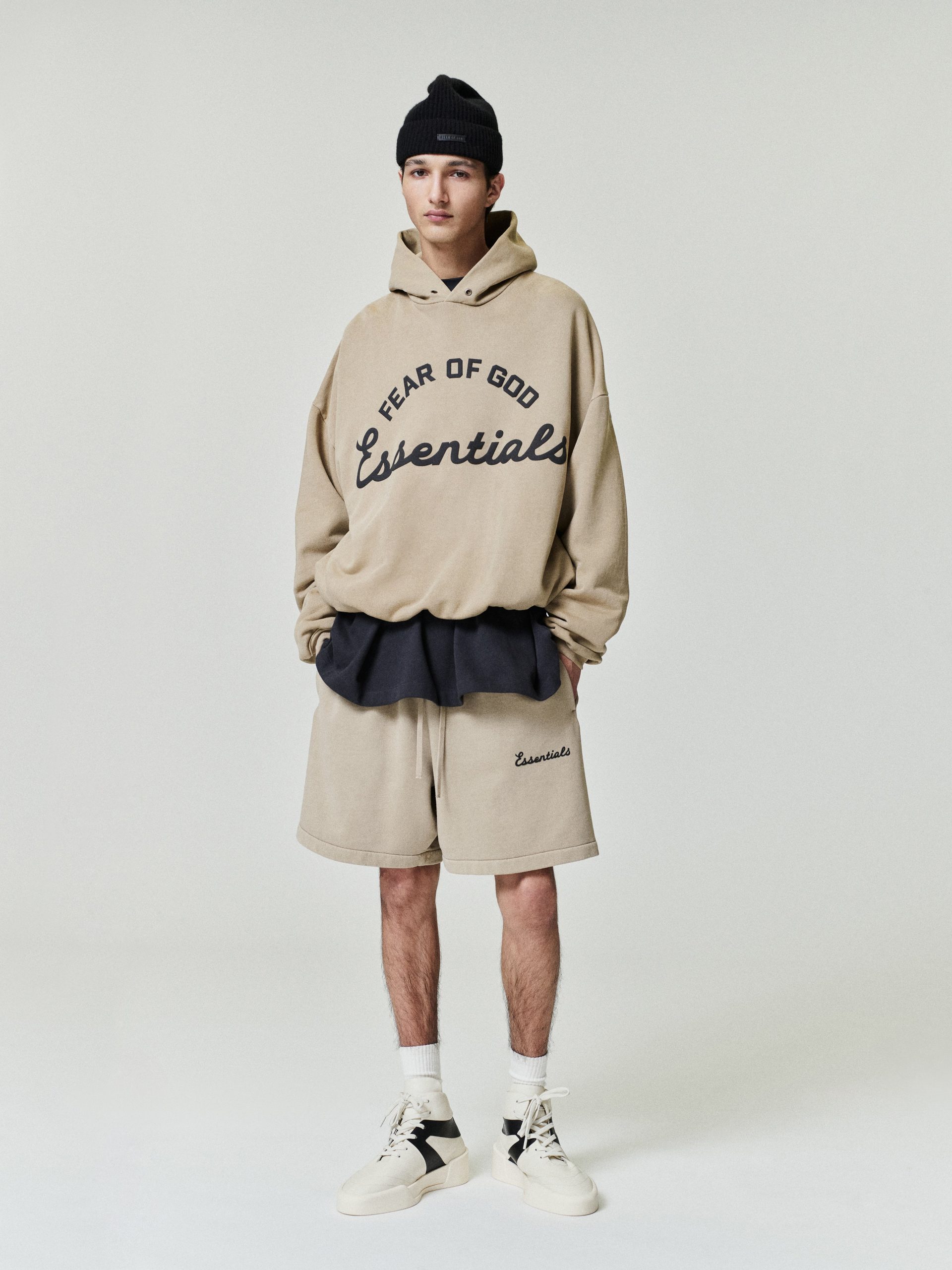 The Training 90s Hoodie is crafted from 390GSM cotton fleece and given a pigment dye for an authentic vintage feel. A puff-printed Fear of God Essentials training logo is branded on the front. Details include a double-layer hoodie. side pockets. rib-knit cuffs. waist-hem. and Essentials label on the hood edge