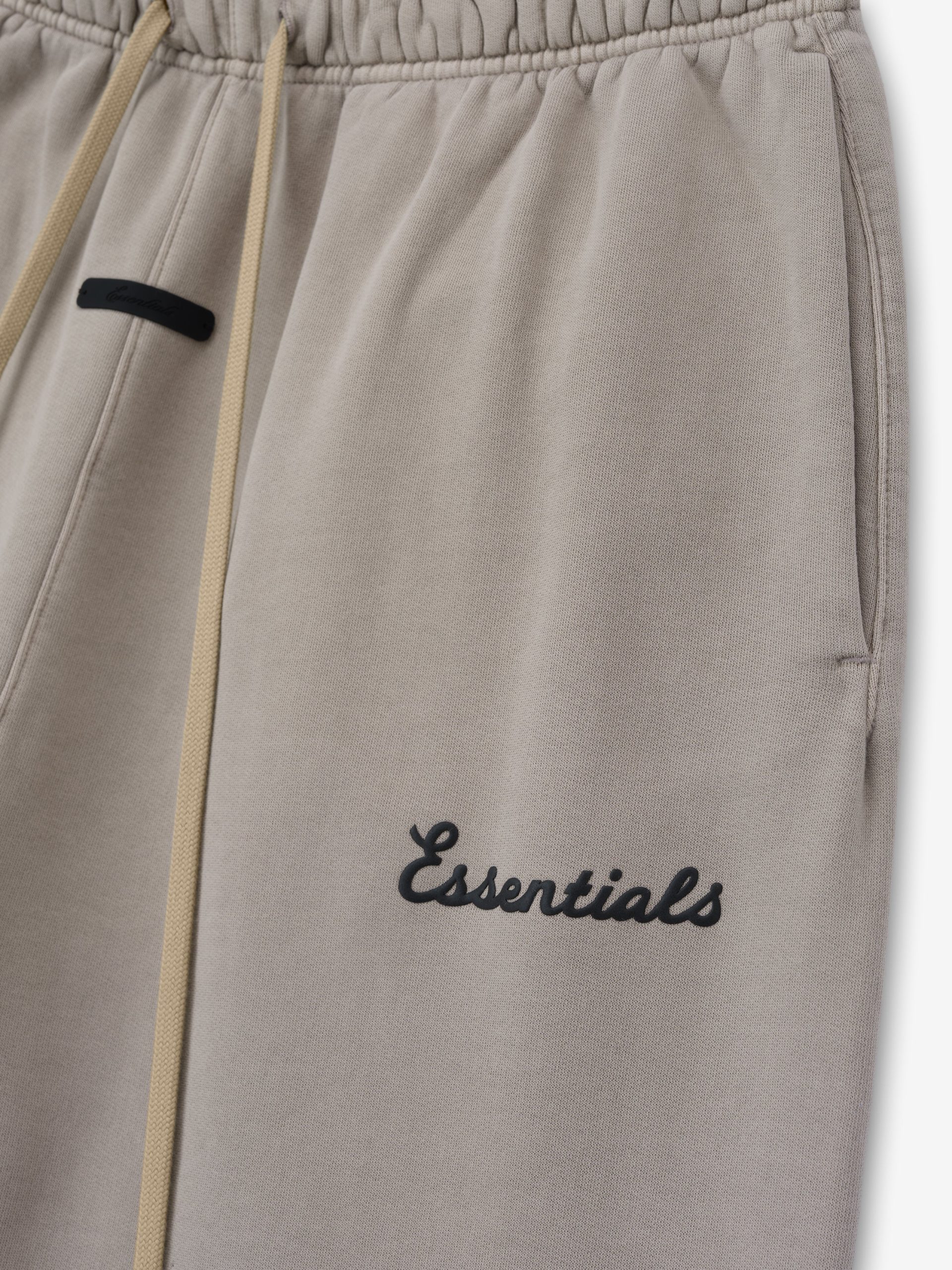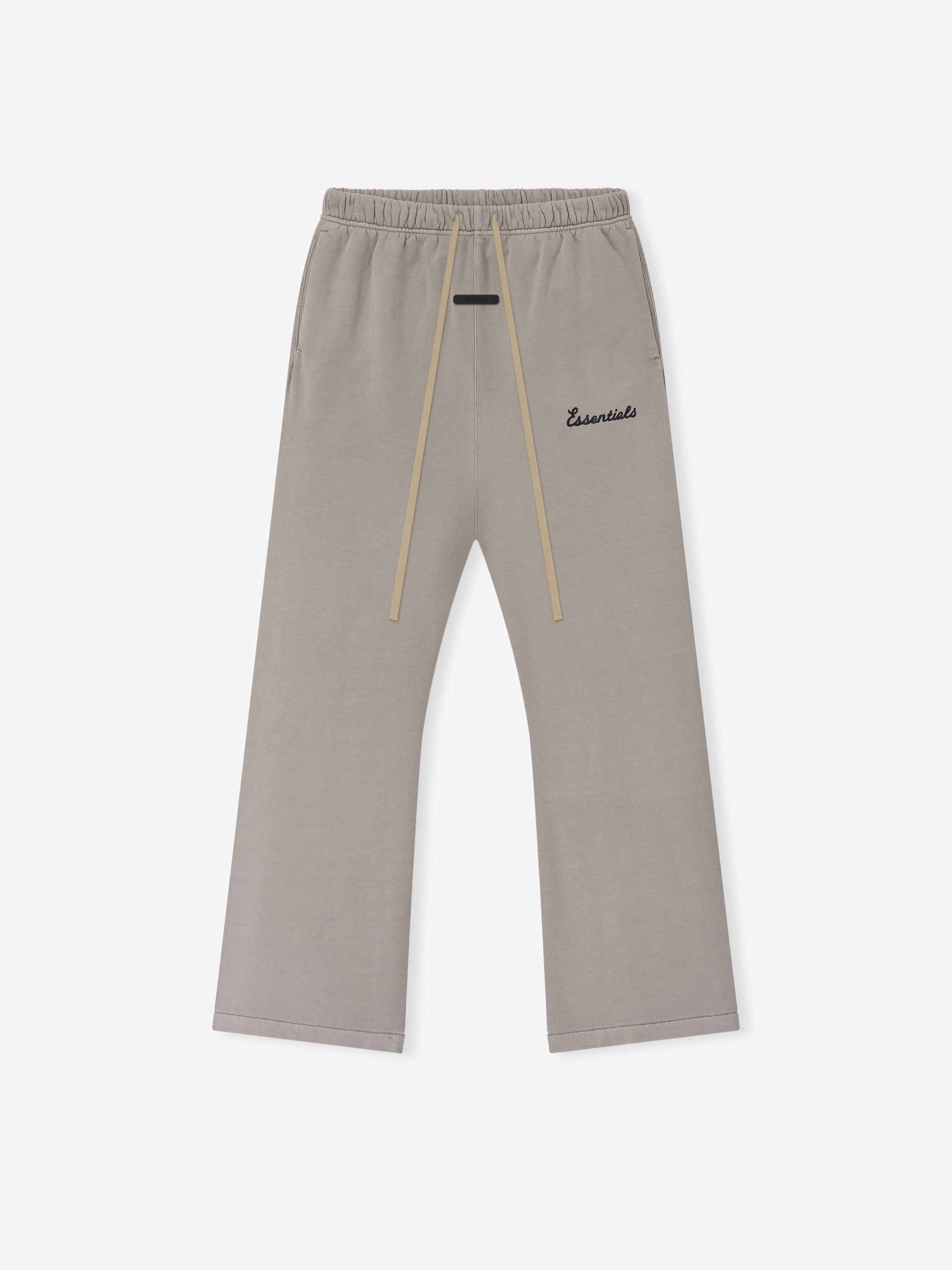 The Training Flare Sweatpant is crafted from 390GSM core fleece. Its relaxed silhouette extends into a flared leg. Branding includes a puff-printed Essentials training logo on the leg and an Essentials signature label at the center front. Completing the design are an encased elastic waistband with elongated drawcords. and side seam pockets.