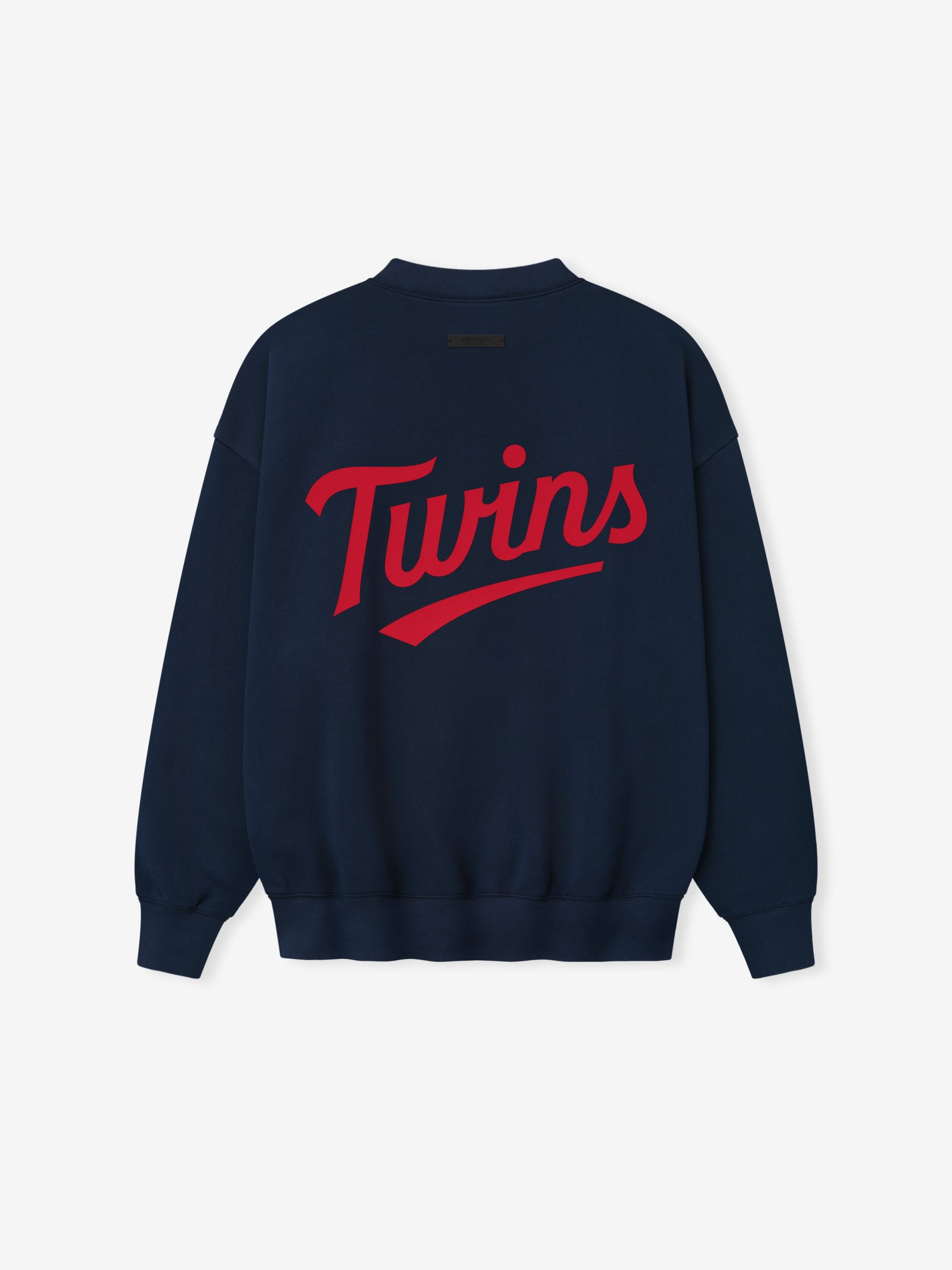 The Twins Sport Crewneck is crafted from core fleece. offering an elevated balance of softness. structure. and lasting comfort. Cut in a relaxed sport fit. it drapes with more ease through the body and extended length compared to the Essentials classic silhouette. The front features a bold puffer-print graphic reading Minnesota Essentials alongside the MLB insignia. while the back is finished with the official Twins logo. Additional details include a kangaroo pocket. rib-knit collar. cuffs and hem. The signature rubberized Fear of God Essentials label accents the back.