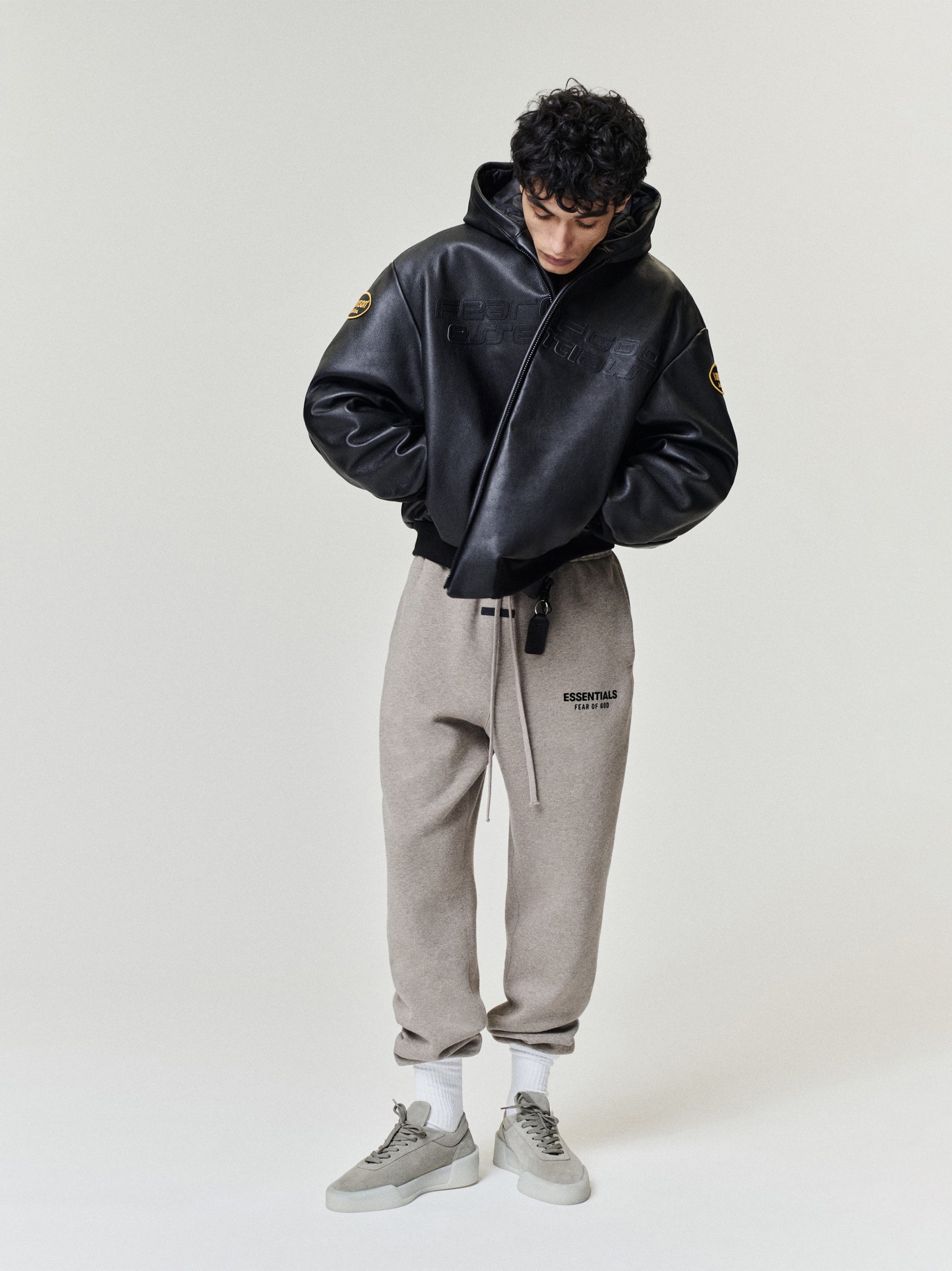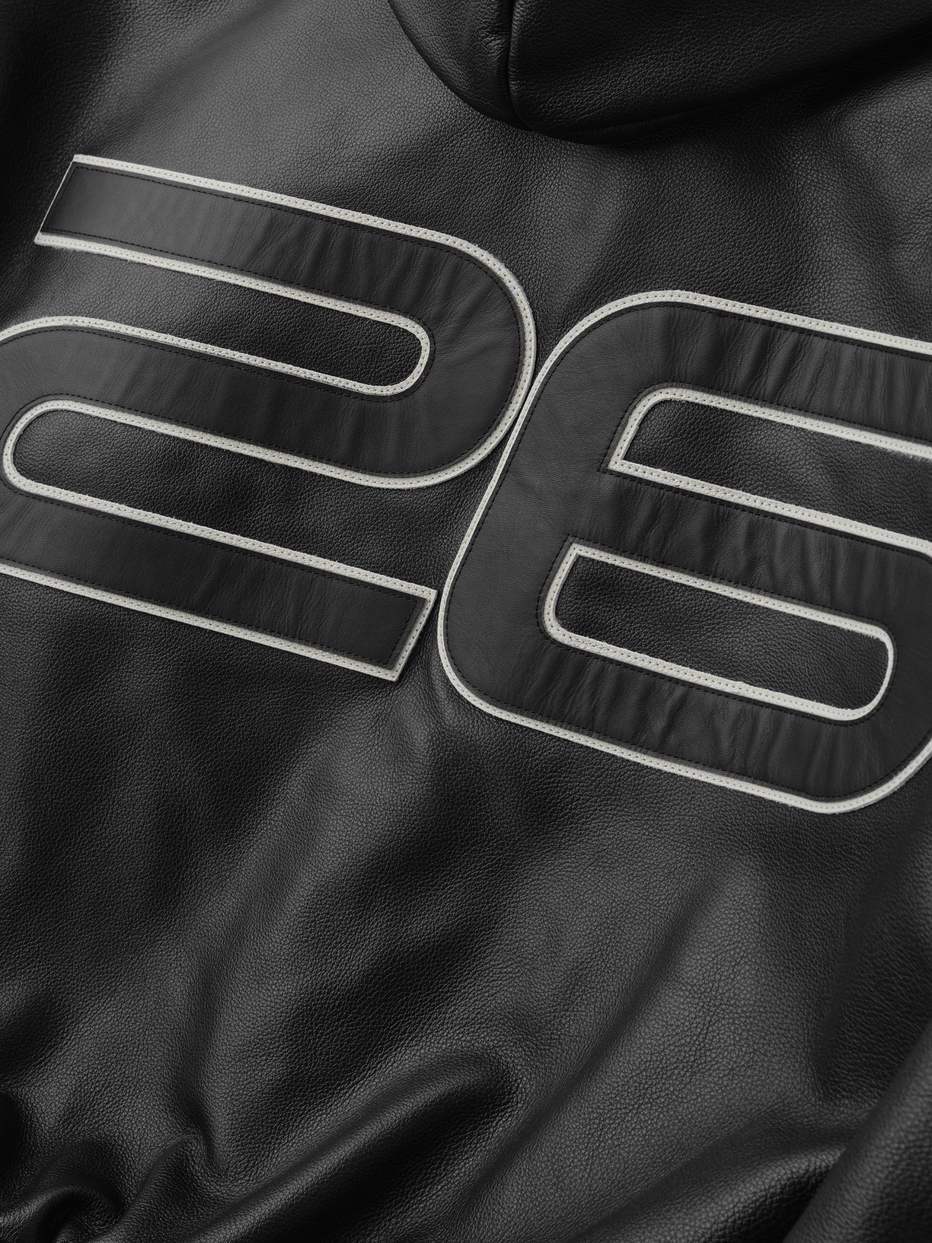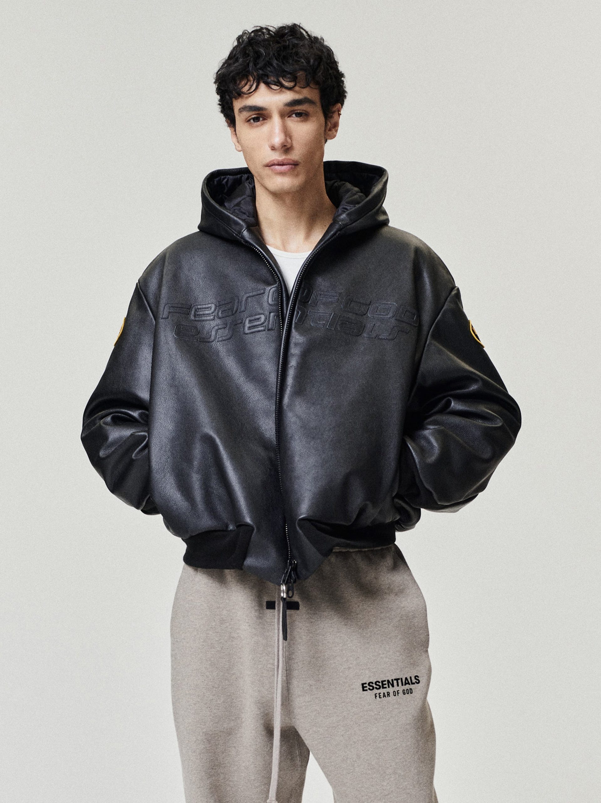 Fear of God introduces a limited-edition collaboration with Vanson Leathers. reinterpreting the House’s classic hooded bomber through the craftsmanship of the Vanson atelier. The design features laser-cut leather applique ESSENTIALS artwork on the front and a bold number 26 on the back. drawing from the visual language of racing and on-court sport. Vanson’s signature patch detailing further underscores the collaboration. Additional elements include a quilted lining. side pockets. and rib-knit cuffs and waist hem for structure and comfort. The piece is finished with a Fear of God label on the hood.