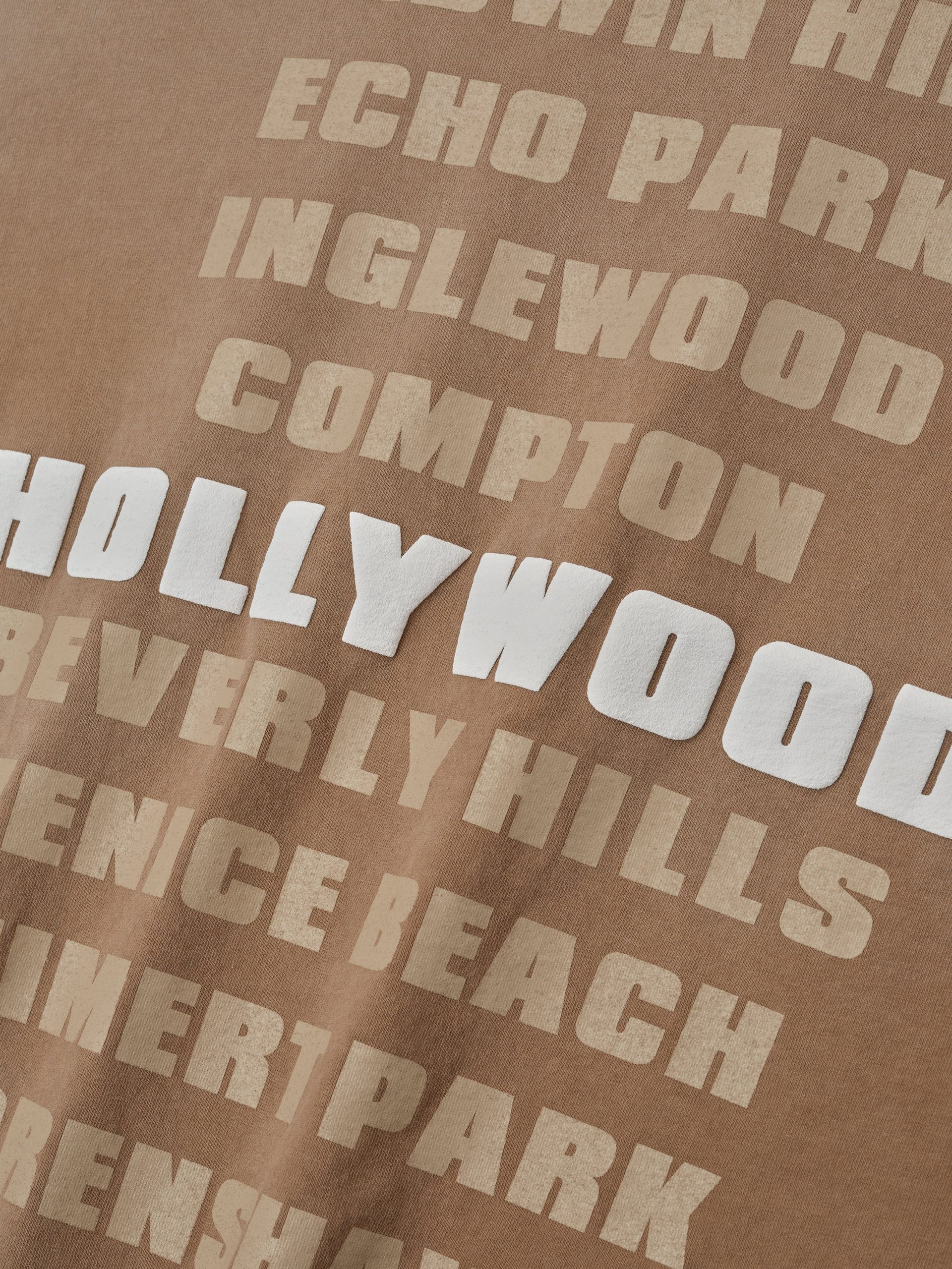 The Vogue Fear of God Neighborhood Tee is crafted in the USA from 100% heavyweight cotton jersey. the silhouette undergoes a specialized garment wash and sun-fade treatment. achieving a lived-in patina. Hand-printed graphics feature the Vogue Fear of God lockup across the chest. while the neighborhoods of Los Angeles are celebrated on the back—a nod to the city’s cultural landscape. Finished with a rib-knit crewneck. drop shoulders. and three-quarter sleeves. the tee drapes effortlessly with a relaxed yet intentional fit. A Fear of God label at the back collar completes the piece.