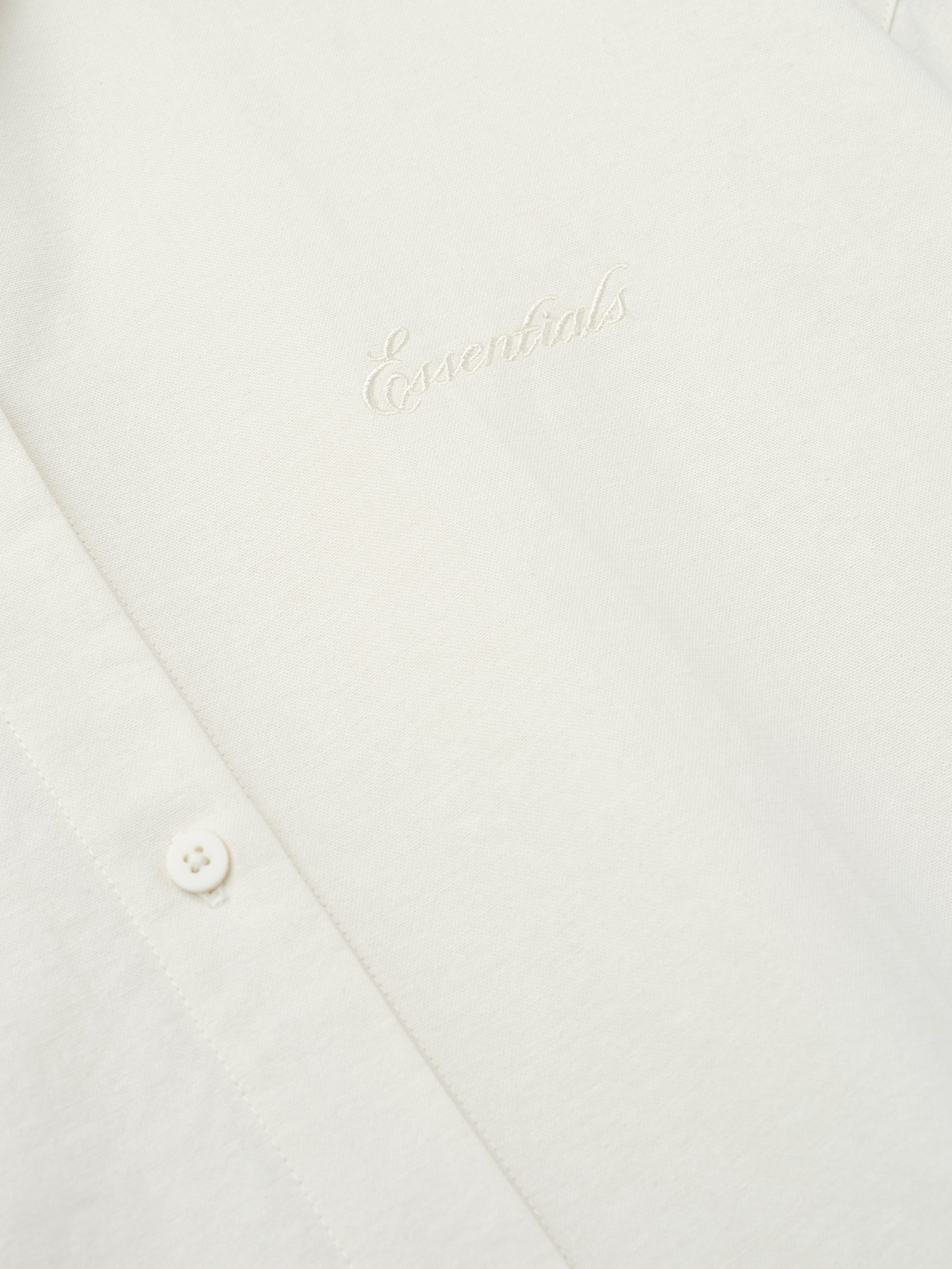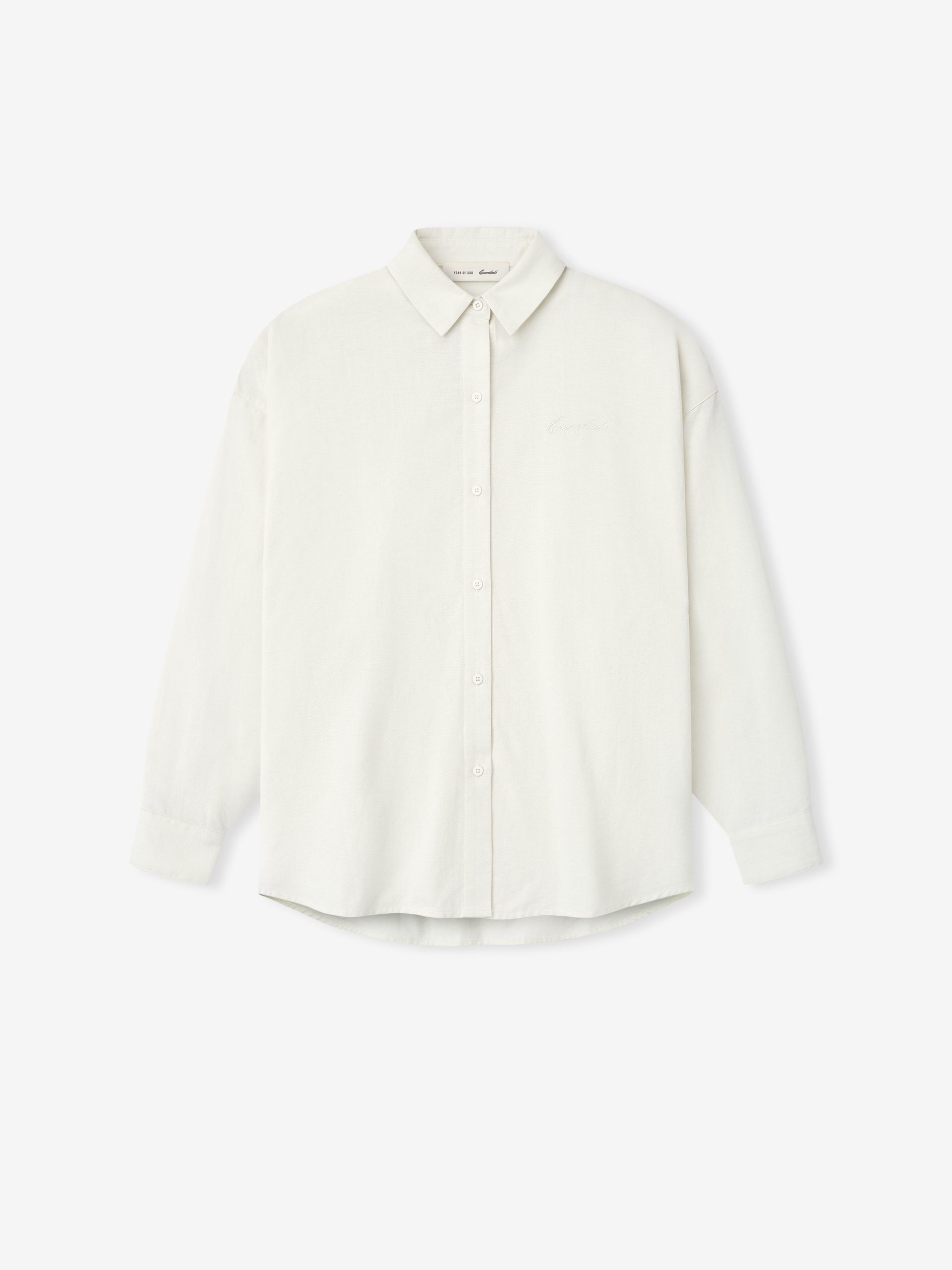 The Signature Button Up Shirt is crafted from 100% cotton Oxford cloth for lightweight comfort. The relaxed fit in the body highlights fabric drape and movement. Additional details include a shirt collar. full front button placket. barrel cuffs. and contoured hemline. The piece is detailed with an embroidered Essentials signature logo. An Essentials signature label is at the back neckline.