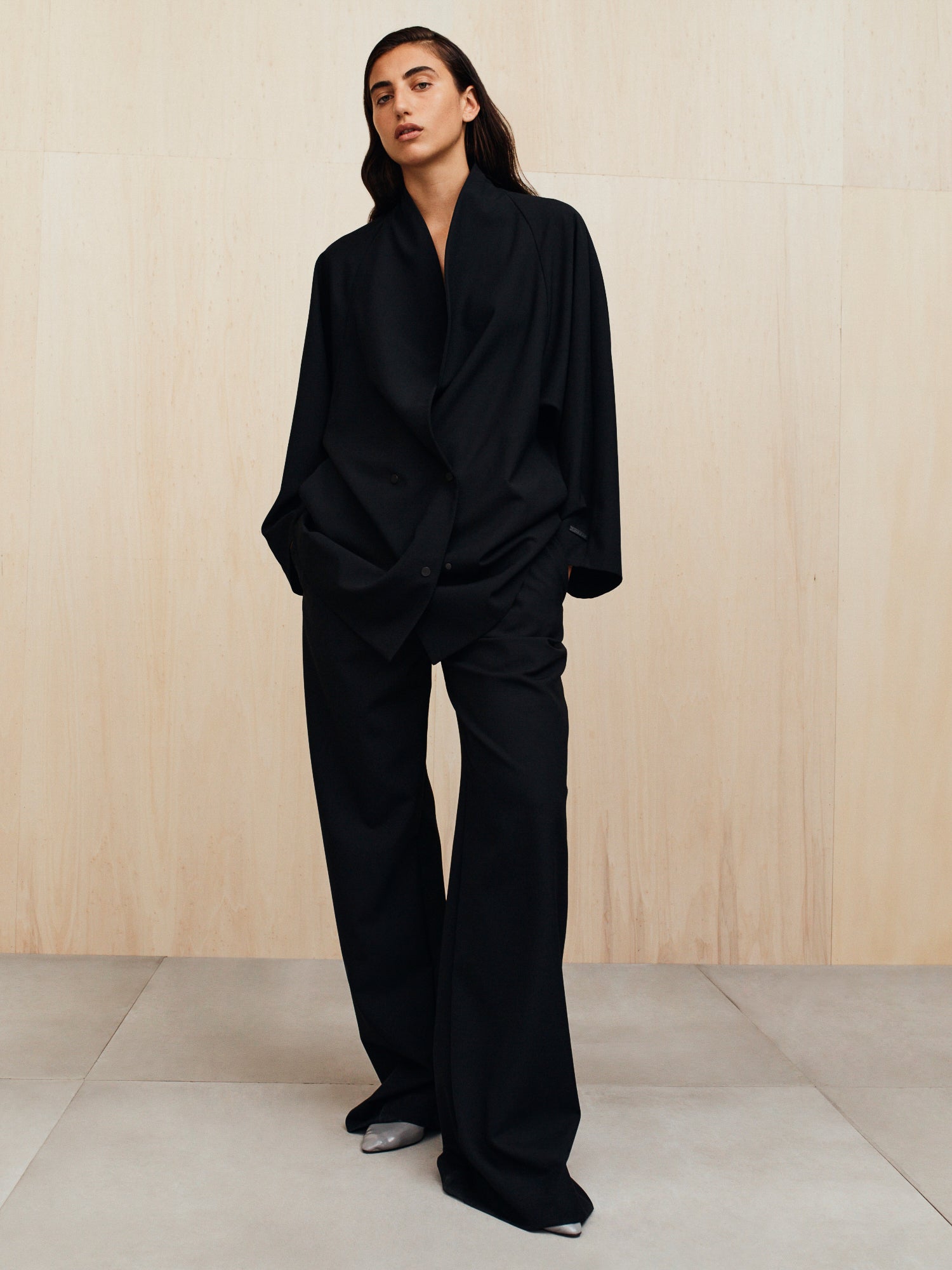 The Women’s Shawl Collar Jacket is tailored in Italy from compact. lightweight wool ripstop with sculpted drape. The shawl collar. relaxed fit jacket features a double breasted front closure with snap buttons. The piece is finished with the iconic Fear of God four-stitch label on the sleeve.