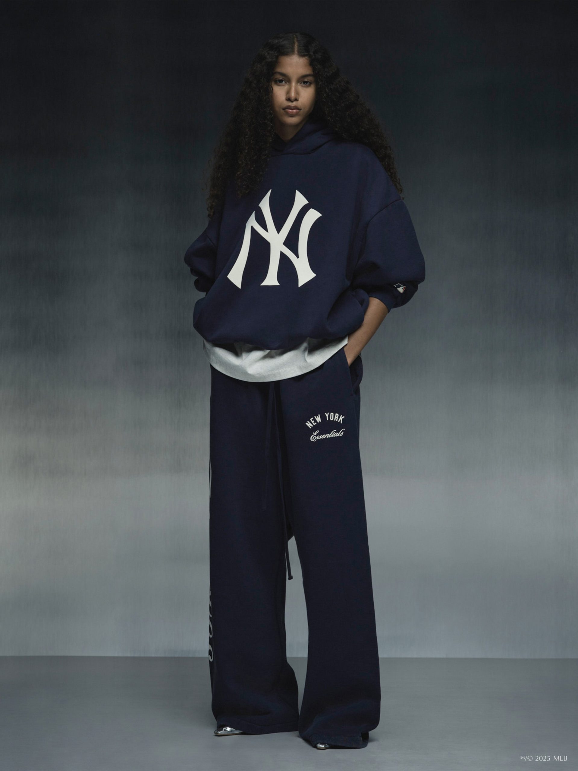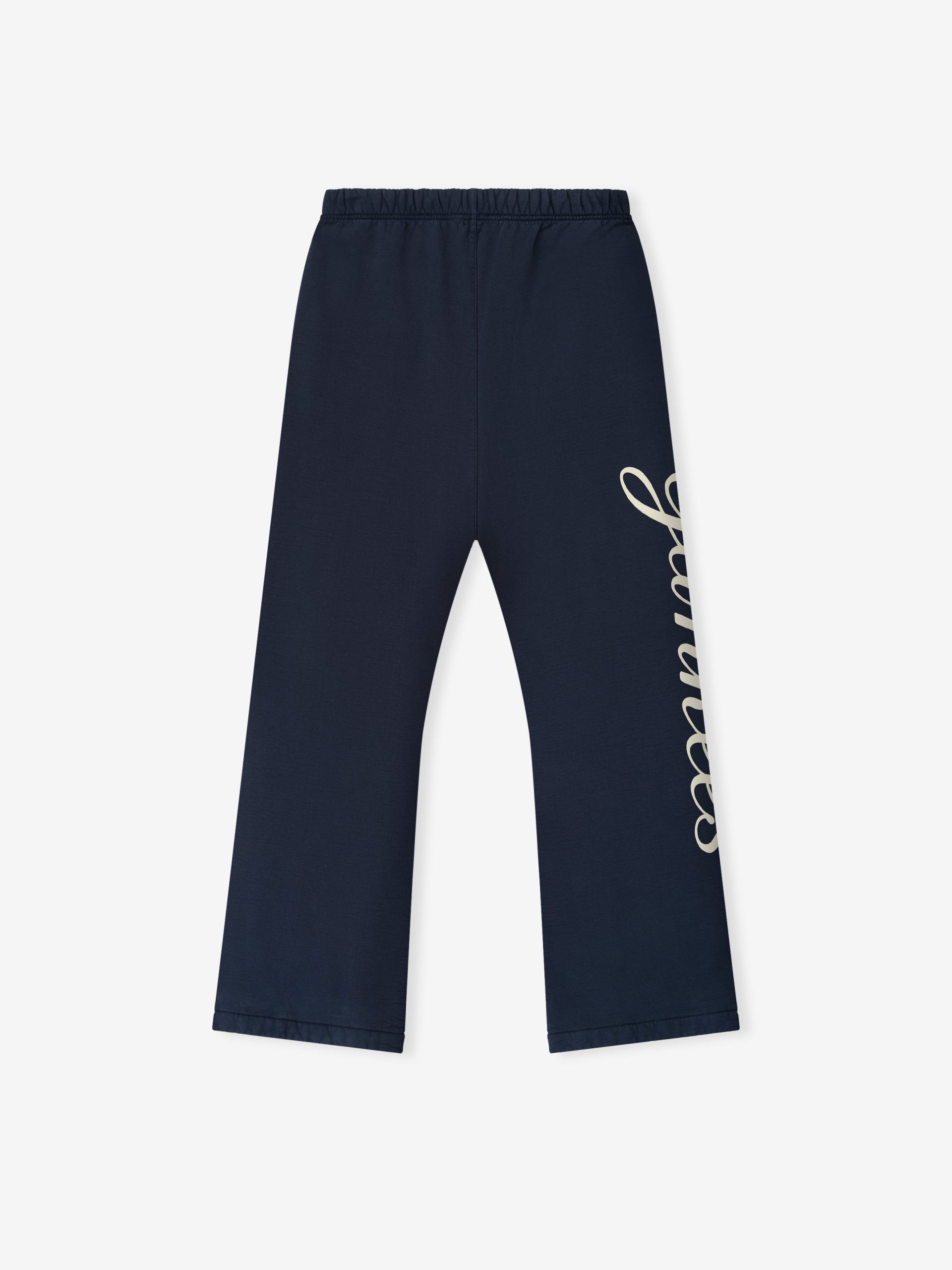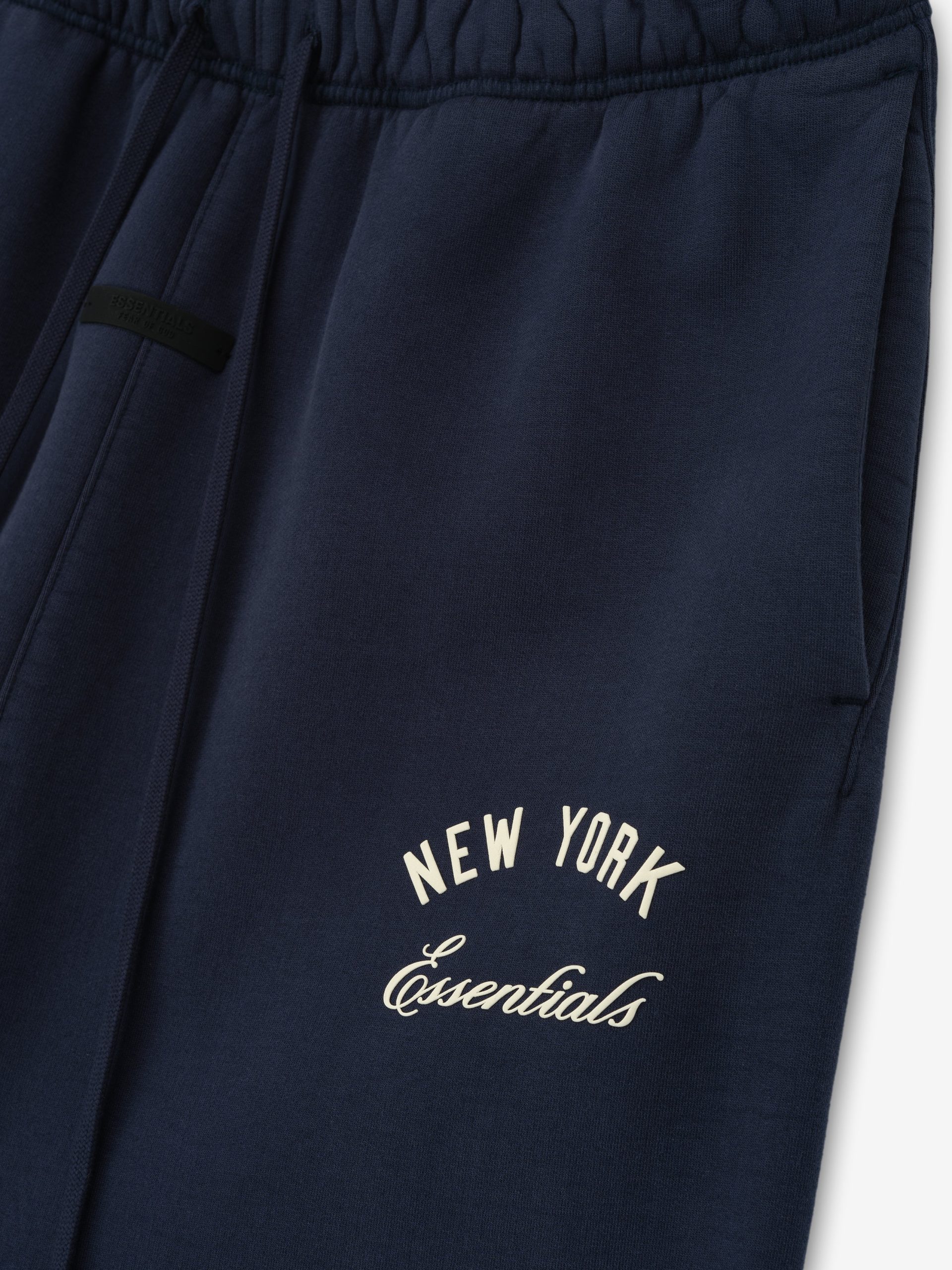 The Yankees Flare Sweatpant is crafted from pigment-dyed. heavyweight 520gsm cotton fleece. offering a softly faded. vintage feel and a relaxed. flared leg silhouette. Branding includes a bold Yankees HD-printed logo down one leg. complemented by a New York x Essentials script lockup on the other. Functional details include an elastic waistband with elongated drawstrings and side pockets. The look is finished with the Essentials Fear of God black bar at the center front.